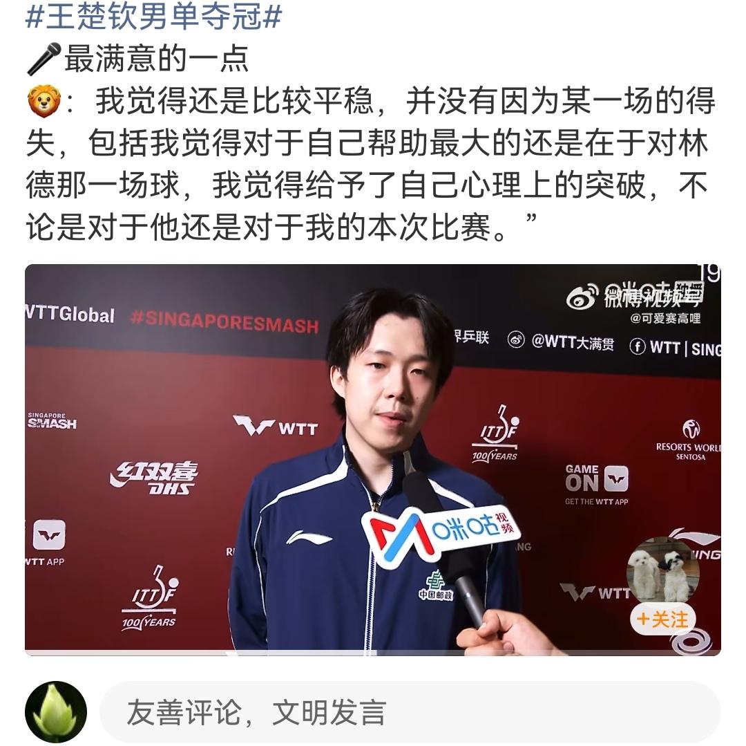 听了王楚钦赛后采访对于新加坡大满贯最满意的一点。 原来巴黎奥运会所有的比赛他都记得非常清楚,林德是唯一一个他输球后一年多时间后再次交手的最后一名对手,王楚钦背负了500多天的压力。 王楚钦说:“我觉得还是比较平稳,并没有因为某一场的得失,包括我觉得对于自己帮助最大的还在于对林德的那一场球,我觉得给予自己的心理的突破,不论是对于他还是对于我的本次比赛。” 听了这段话,会真的非常心疼王楚钦,这么努力优秀的年轻人,因为低谷期的一场比赛输球,他拿了这么多冠军,几乎赢了所有的对手,他却始终记得输过的那一场比赛,现在终于赢了所有的对手,楚钦希望你开心快乐的打球,不必背负太多的压力。 也很喜欢你拿下冠军后说的,心情舒畅,漫长的新加坡之旅终于结束了,非常高兴属于自己的开心时刻,希望有更多的机会对你们说谢谢! 相信你会有很多很多的机会对所有的球迷说谢谢!也谢谢这个时代优秀的你们!