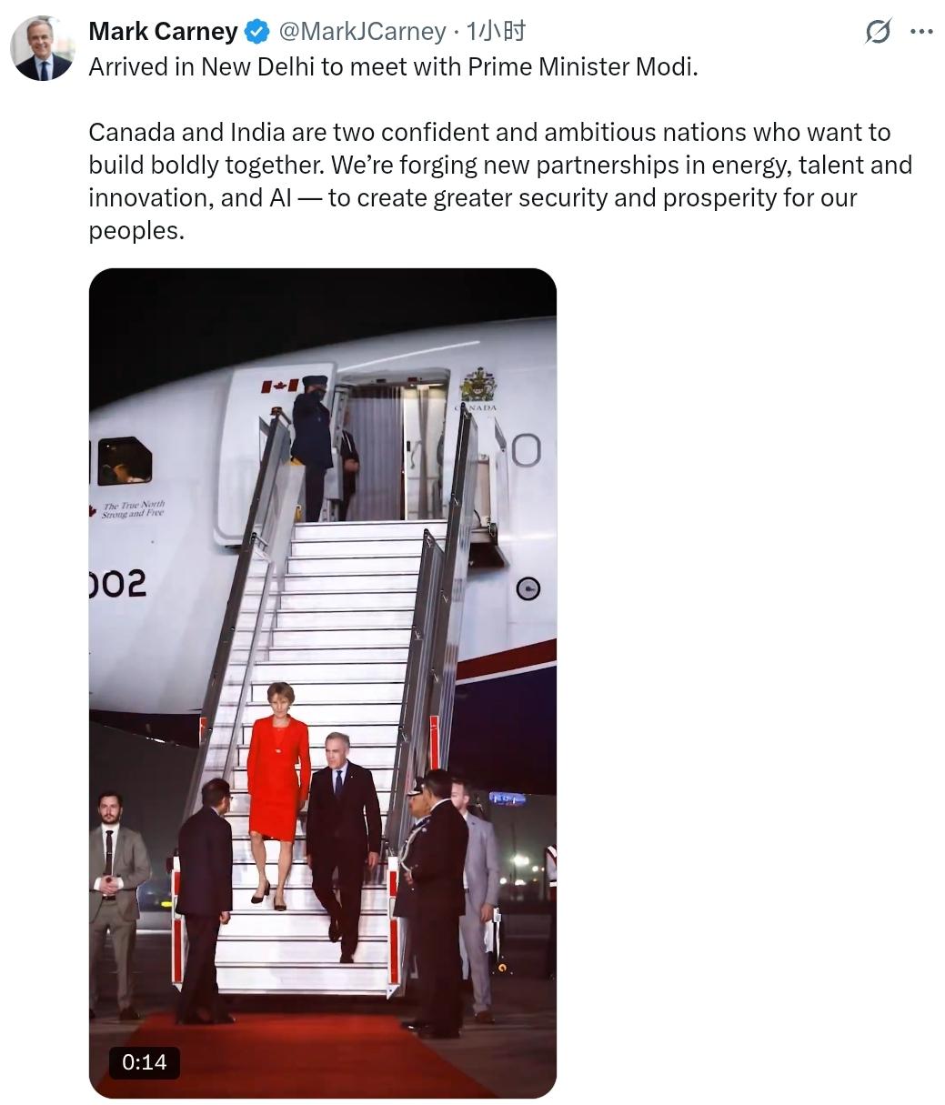 加拿大总理马克卡尼: 抵达新德里会见莫迪总理,加拿大和印度是两个充满自信和雄心壮志的国家,希望携手共建美好未来。我们正在能源、人才、创新和人工智能领域建立新的伙伴关系,以期为两国人民创造更大的安全与繁荣。