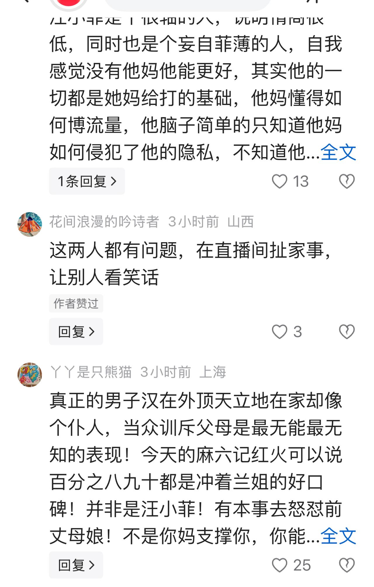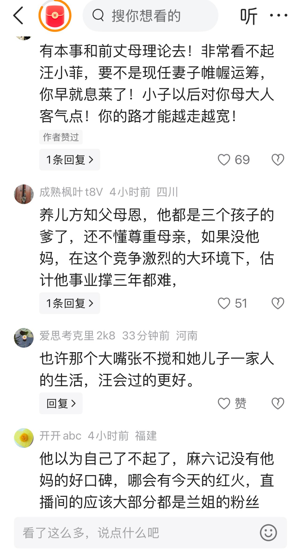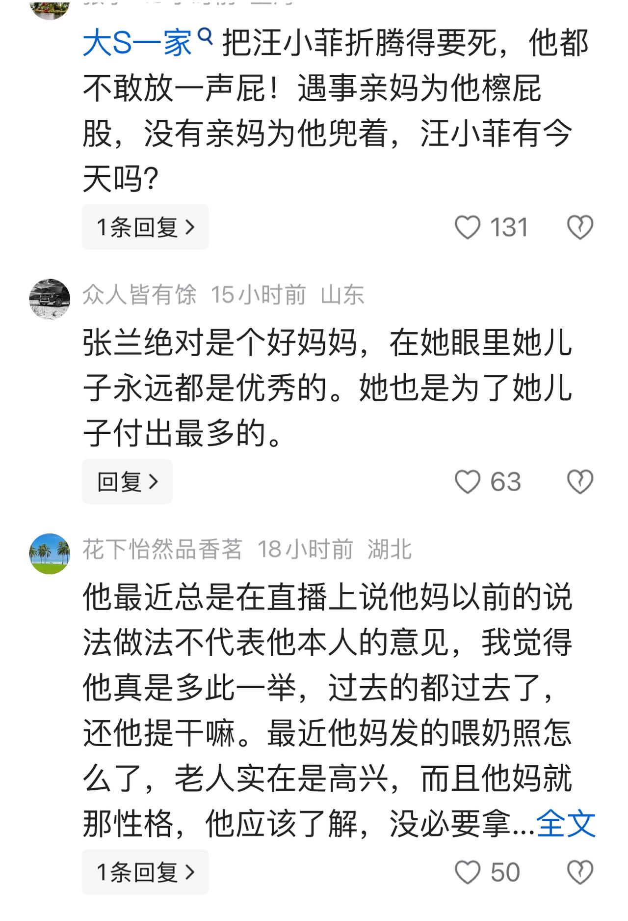 汪家添人加口,马筱梅生了一个漂亮的宝宝,张兰再次当奶奶自然高兴的嘴都合不拢。做为一个老年人,在大家面前炫孙子本来就是再正常不过的事情了.如果网友们说了什么情有可原。可是当自己的亲儿子指责:"拿他喂奶的照片立人设时"外人听着都十分不舒服,何况是张兰本人呢? 事情的发生是有原因的,大家都记得一年前的事情。汪小菲是被一年前的事情吓怕了,被封了账号至今没有解。他对"点赞包机"一事始终不能忘。更不喜欢"张兰母子"这样的绑定。声称:"她是她、我是我"说了一些伤人的话。 网友们看到张兰见到生汪小宝时的神采飞扬,到如今的落寞神态,实在看不过眼了,开始同情这个年近七十的老人:指责汪小菲:对母亲不该出口伤人。于是纷纷流言。 家家都有一本难念的经,做过父母的人都能理解张兰现在的感受。真的希望汪小菲不要在做憨事。对于这件事情你们怎么看?母亲遭指责,网友看不下去