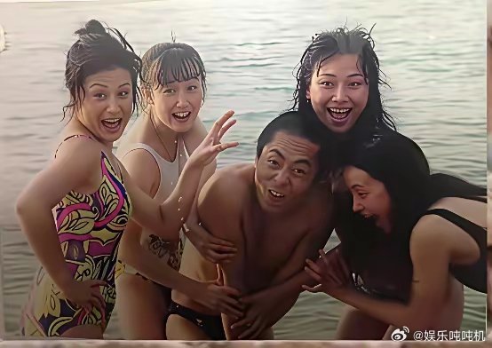 图中中间是导演张艺谋。根据多位媒体和博主的描述,他身旁的四位年轻女性是当时中央戏剧学院的学生,其中可以辨认出的是于月仙(左一)和陶虹(右二)。这张照片拍摄于1995年,是张艺谋为电影选角时,为缓解学生紧张情绪而组织的户外活动留影。
