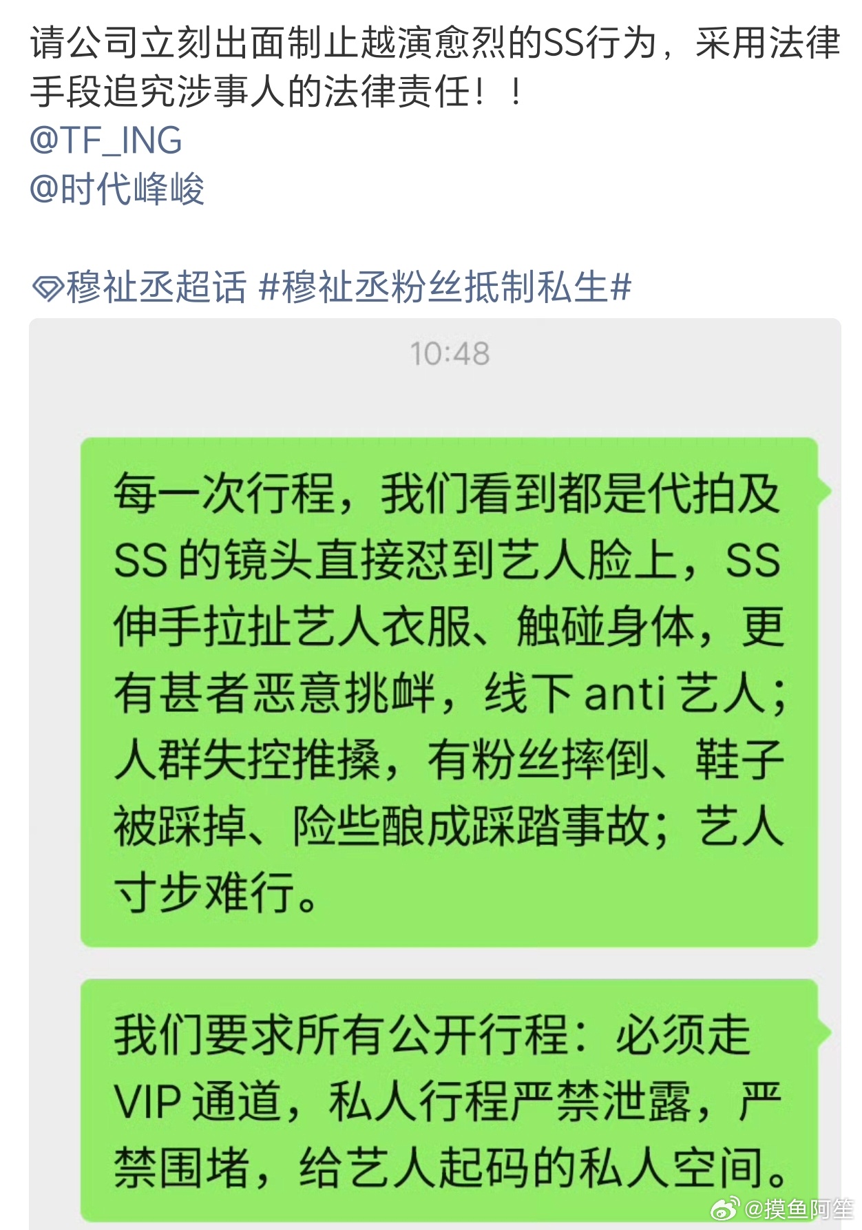 穆祉丞粉丝对最近频繁发生的私生围追堵截问题向公司维权了。小穆也不过刚成年几个月,实际上还是个小孩,一堆成年人这么欺负一个小孩就为了激起他的反抗,跟虐猫人的心态有什么区别呢,太过分了。支持粉丝维权!穆祉丞机场怒斥私生