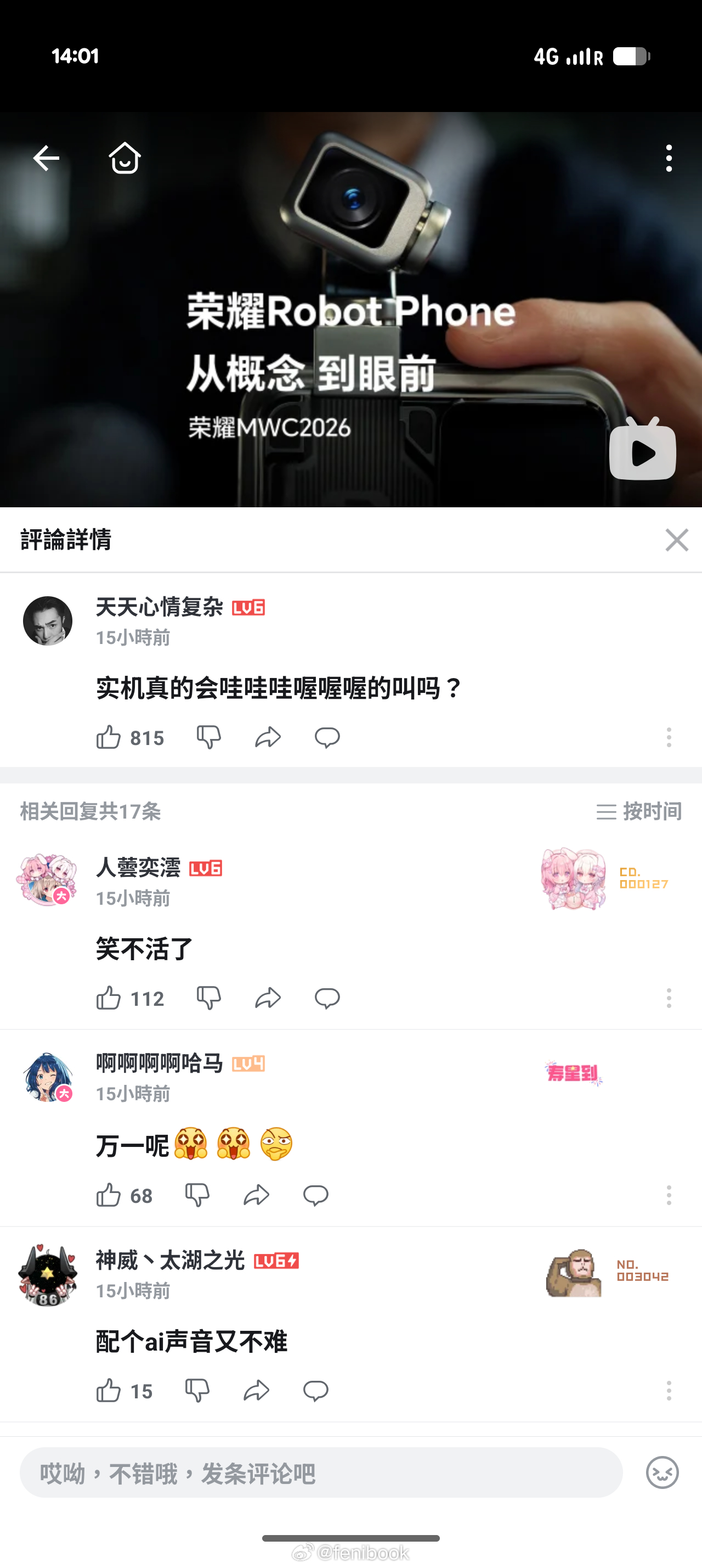 草,奇怪的关注点有网友问,荣耀Robot Phone 上市后盖真机真的会和广告中那样嗷嗷叫吗?我感觉不会,大概率是广告创意,不过技术上实现起来也不难