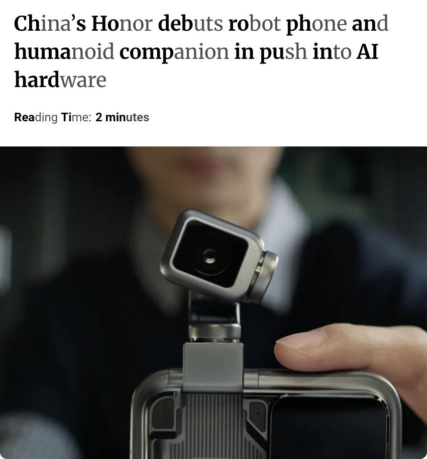 外媒:荣耀发布"机器人手机"及人形AI助手,大举押注AI硬件 中国智能手机品牌荣耀在巴塞罗那MWC展前发布会上推出三款新品:旗舰折叠屏手机、"AI机器人手机"以及首款人形AI助手,在激烈的安卓市场竞争中以AI硬件为差异化突破口。 荣耀机器人手机最大亮点是配备可电动驱动的三轴云台机械臂摄像头,能够追踪运动目标、全角度视频通话,并响应用户指令做出点头等动作,甚至随音乐起舞。 荣耀CEO表示:"太长时间以来,智能手机不过是一块黑色矩形。我们决定赋予下一代设备不仅有大脑,还有手和脚。"他强调,这款产品有别于目前市场上依赖截屏和语音指令的AI手机,云台摄像头在稳定性和跟踪运动物体方面,可与大疆等运动相机品牌抗衡。该机器人手机计划于今年下半年正式上市。