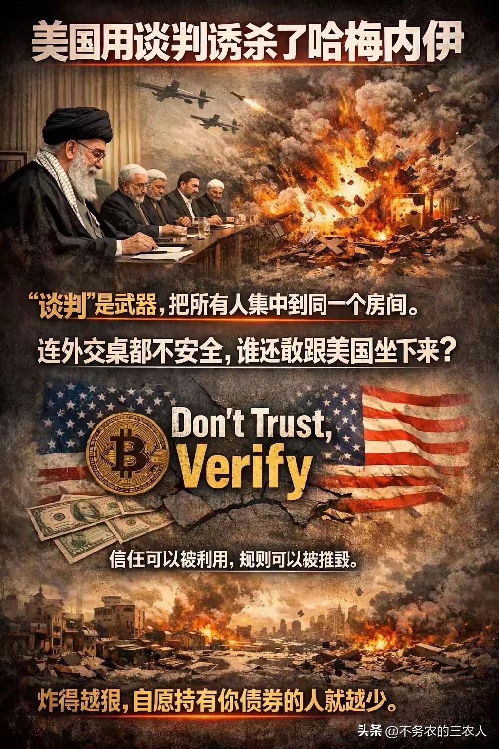 这张图,把美国的霸权逻辑扒得一丝不挂:用“谈判”当诱饵,把对手诱到桌前,再用导弹把整个房间炸成废墟。 哈梅内伊遇袭事件,撕下了美国“民主灯塔”“规则守护者”的最后一块遮羞布。它用最血腥的方式告诉世界:在美国眼里,外交桌从来不是谈判的场所,而是猎杀的陷阱;所谓的国际规则,不过是它用来束缚对手、放纵自己的工具。 当一个国家可以随意用“谈判”诱杀他国领导人,当它可以无视所有国际法和基本道义,用最卑劣的手段达成目的时,这个世界就彻底变成了一个弱肉强食的丛林。 当美国的信用彻底破产,当全世界都看清它的无耻与双标,谁还敢把自己的命运和财富,寄托在这样一个毫无底线的国家身上? 所以,千万不要高估美国人的底线。 它的底线,就是没有底线。 它的规则,就是弱肉强食。