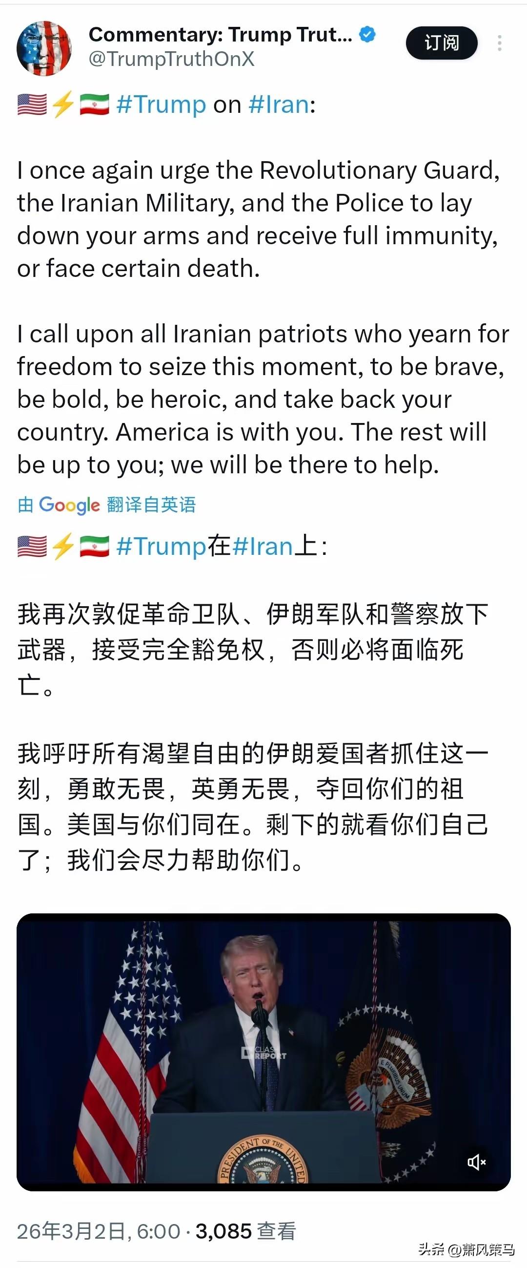 特朗普这是急了吗? 北京时间3月2日,他喊话伊朗军方放下武器换豁免权,不然就只有死路一条,还鼓动伊朗民众起来“夺回国门”,扬言美国会撑腰。 这话听着实在讽刺!美以主动挑起战火,炸伊朗的土地、伤伊朗的百姓,现在打不赢就想策反内部,玩起心理战。 真当伊朗军民是软柿子?革命卫队硬刚美以多轮反击,伊朗民众更是同仇敌忾,特朗普的空头支票,怕是连自己都不信。嘴上说帮忙,实则想坐收渔利,这种霸权套路,早就被看穿了!