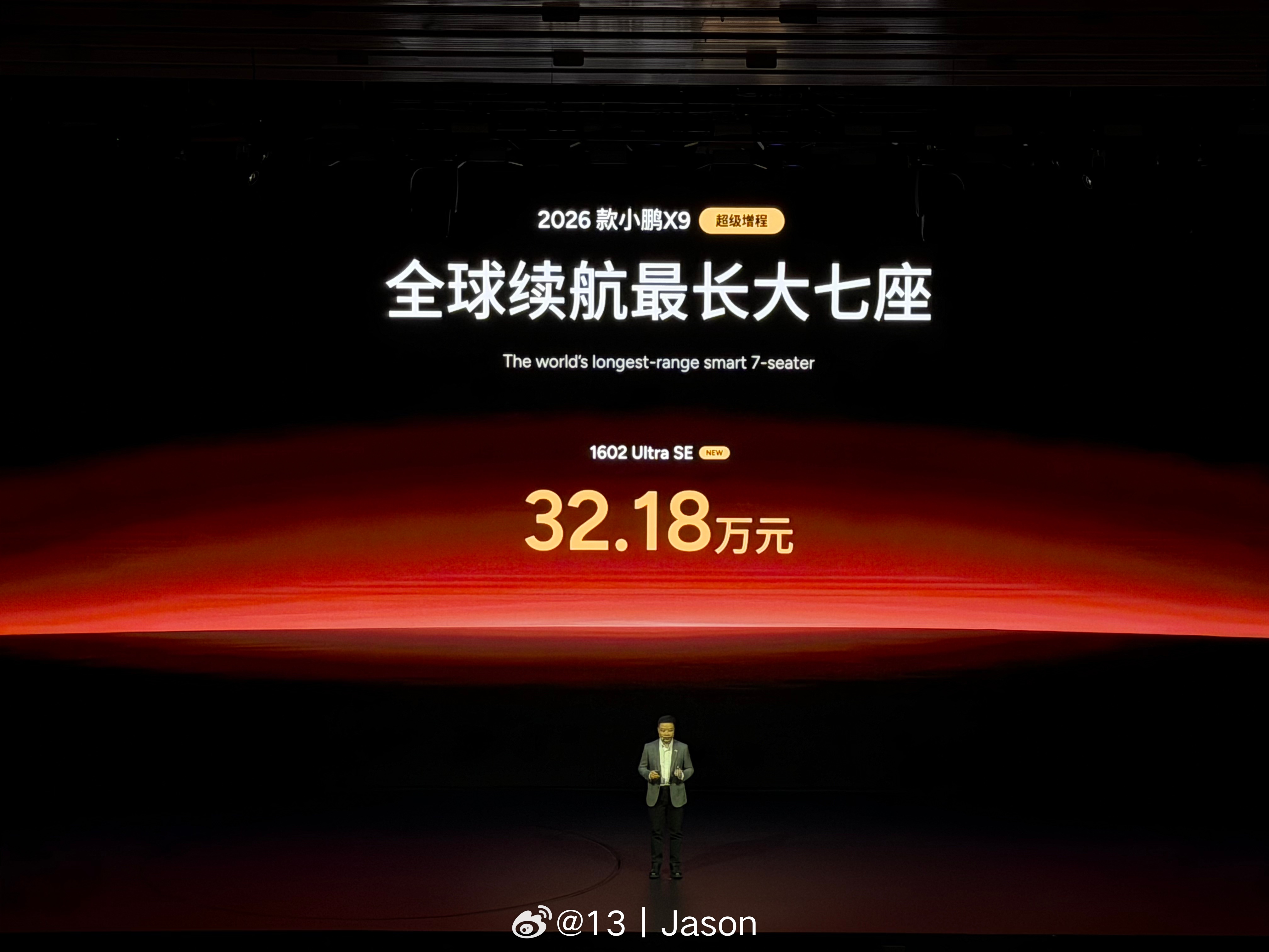 2026 款小鹏 X9 超级增程新增 1602 Ultra SE 版本,价格为 32.18 万元。