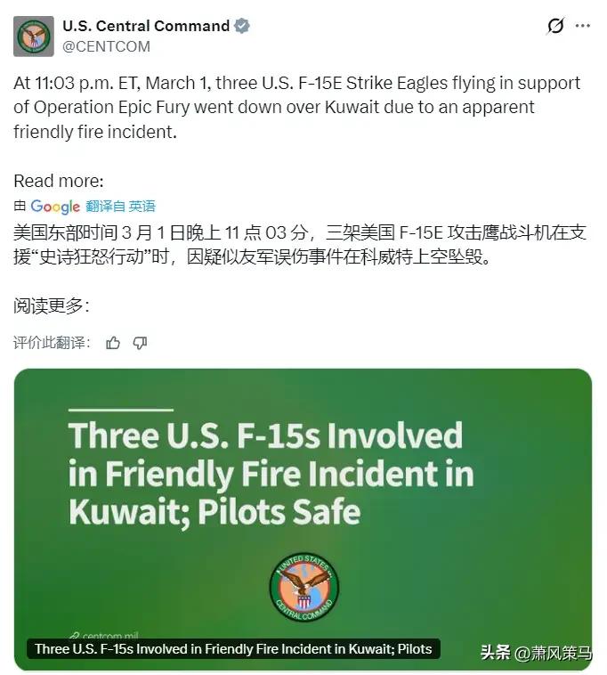 美军又闹大乌龙了!美东时间3月1日深夜,三架F-15E战机在科威特上空集体坠毁,美中央司令部亲口承认,疑似友军误伤! 这可是支援“史诗狂怒行动”的主力战机,号称战场多面手,结果没折在对手手里,反倒栽在了自己人枪口下,属实离谱到家! 战场乱成一锅粥,自家装备认不出自家战机,这哪是军事行动,简直是演闹剧!数亿美元的战机说没就没,美军的作战协同能力,这下被扒得底朝天,脸都丢到中东了!