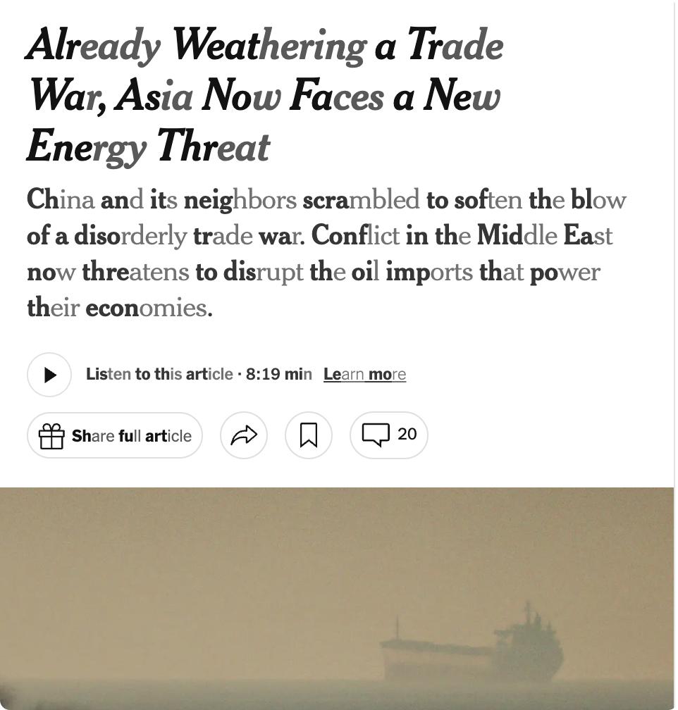 美媒:美以对伊朗的军事打击正将亚洲各大经济体推入能源危机边缘。全球五分之一的石油经霍尔木兹海峡运输,其中大部分流向亚洲。 各国对中东石油的依赖程度触目惊心。日本超过90%的石油经由霍尔木兹海峡进口,韩国约70%的原油来自中东,台湾约60%的石油和三分之一的天然气经此运抵,中国海运原油中逾半数来自中东,其中四分之一来自伊朗。 储备方面:日本拥有254天石油储备,韩国超210天,中国约115天,台湾石油储备约120天,但天然气仅够11天。台湾情况尤为危急——台积电等芯片巨头支撑全球先进半导体供应,一旦电力中断,后果波及全球。 目前油轮已开始绕行更长航线,保险成本飙升,港口出现积压,油价大幅上涨。中国呼吁各方立即停火,印度则处境两难——刚与特朗普达成协议承诺用波斯湾石油替代俄罗斯供应,却遭遇中东局势突变,现面临计划落空风险。