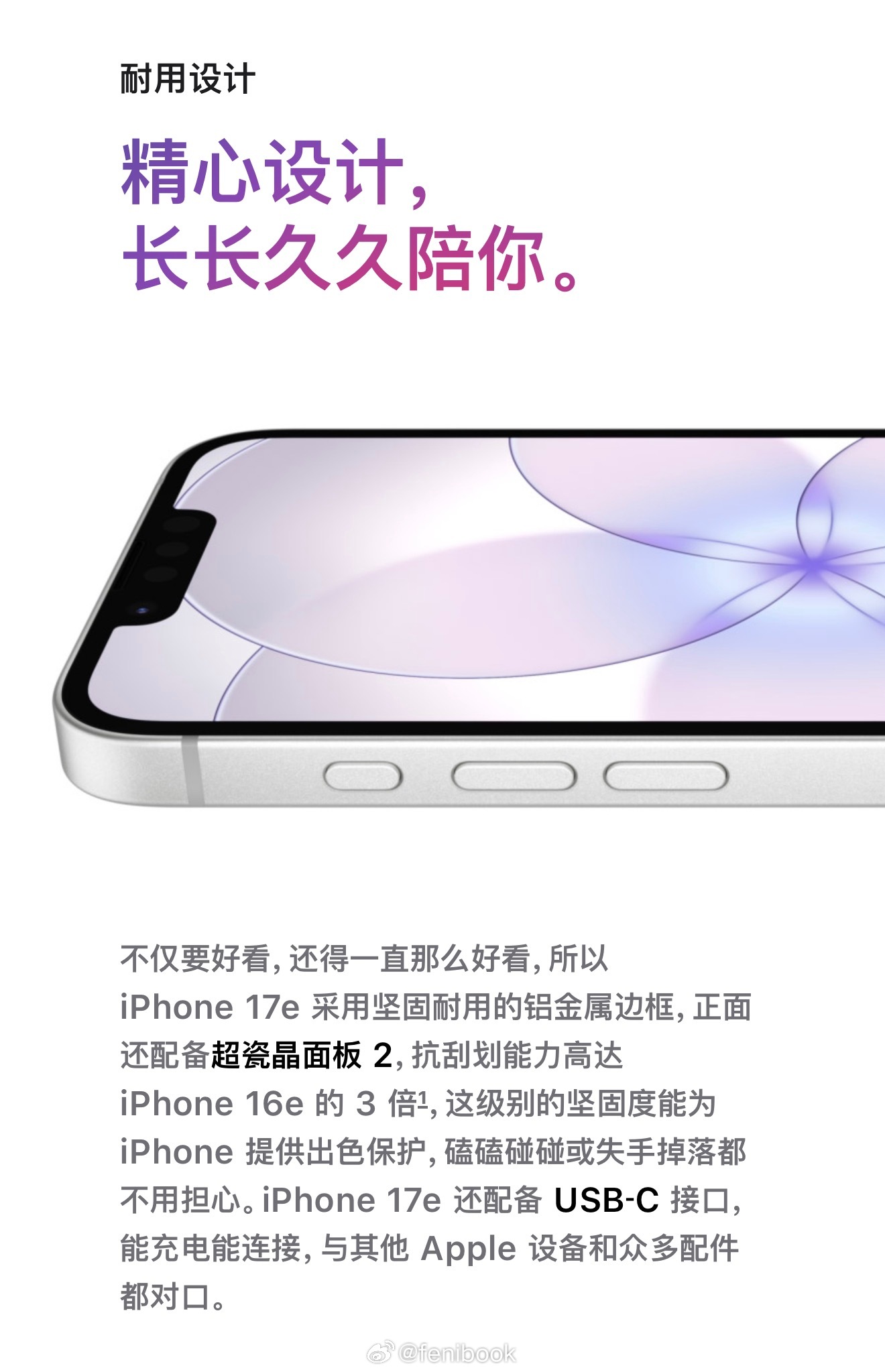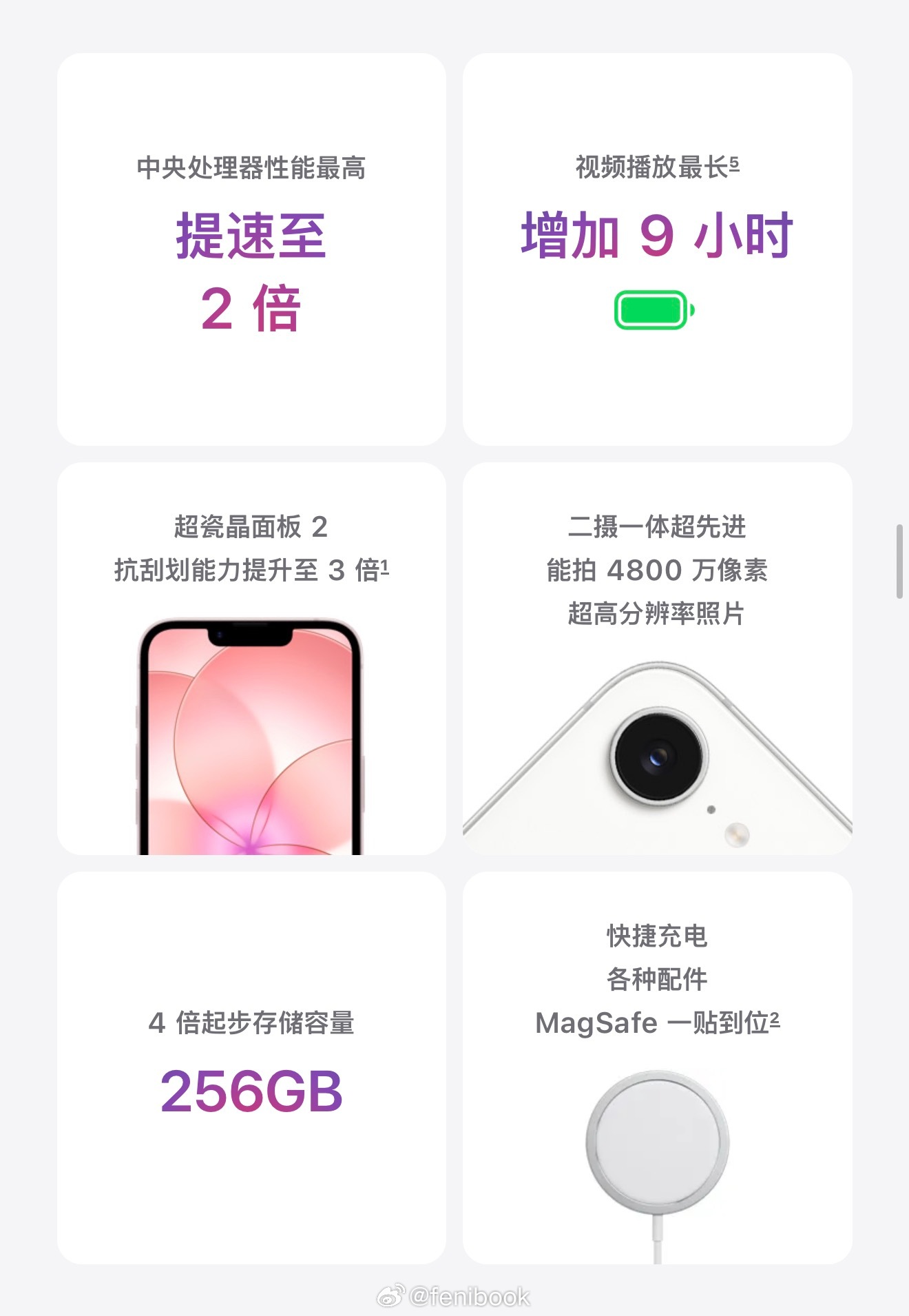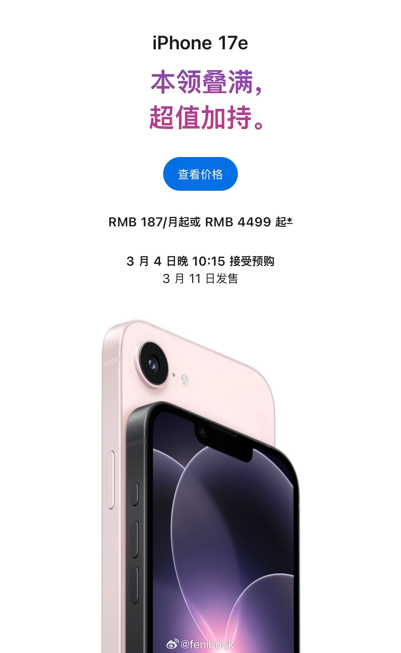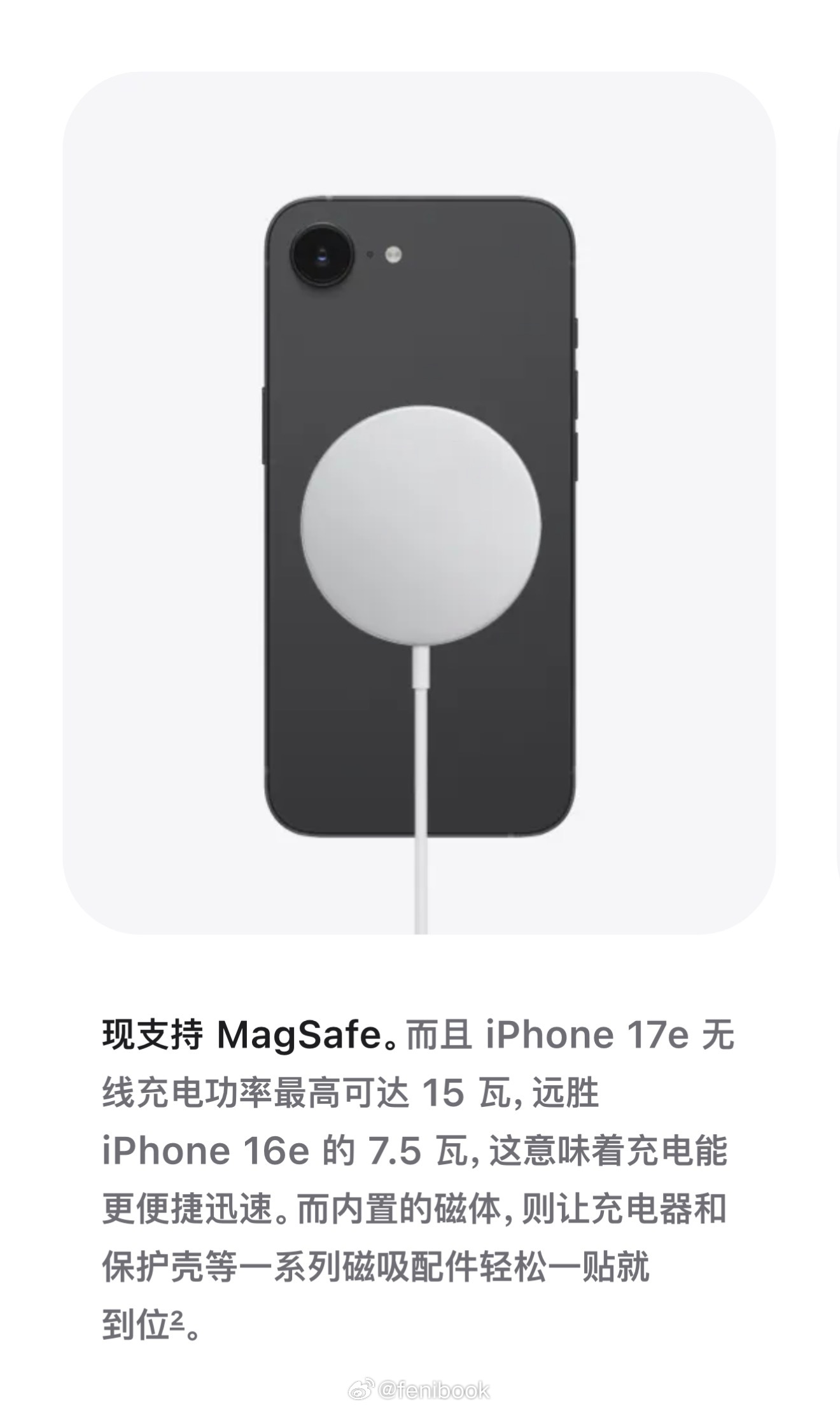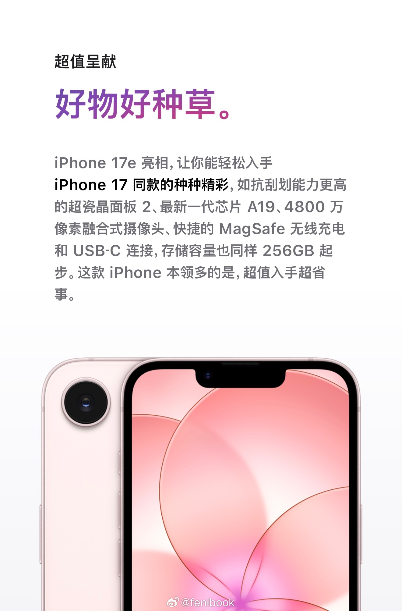 iPhone17e来了来了来了,终于来了!依旧是刘海屏幕,依旧是60Hz,外观、三围都没变,相比前代,iPhone 17e主要有以下几点提升:1、处理器提升为A19,2、屏幕升级为超瓷晶面板2,3、终于支持MagSafe磁吸,4、比前代重了3g,重量170g,5、支持eSIM卡,256G起售4499,512G直接6499,这价格很Apple