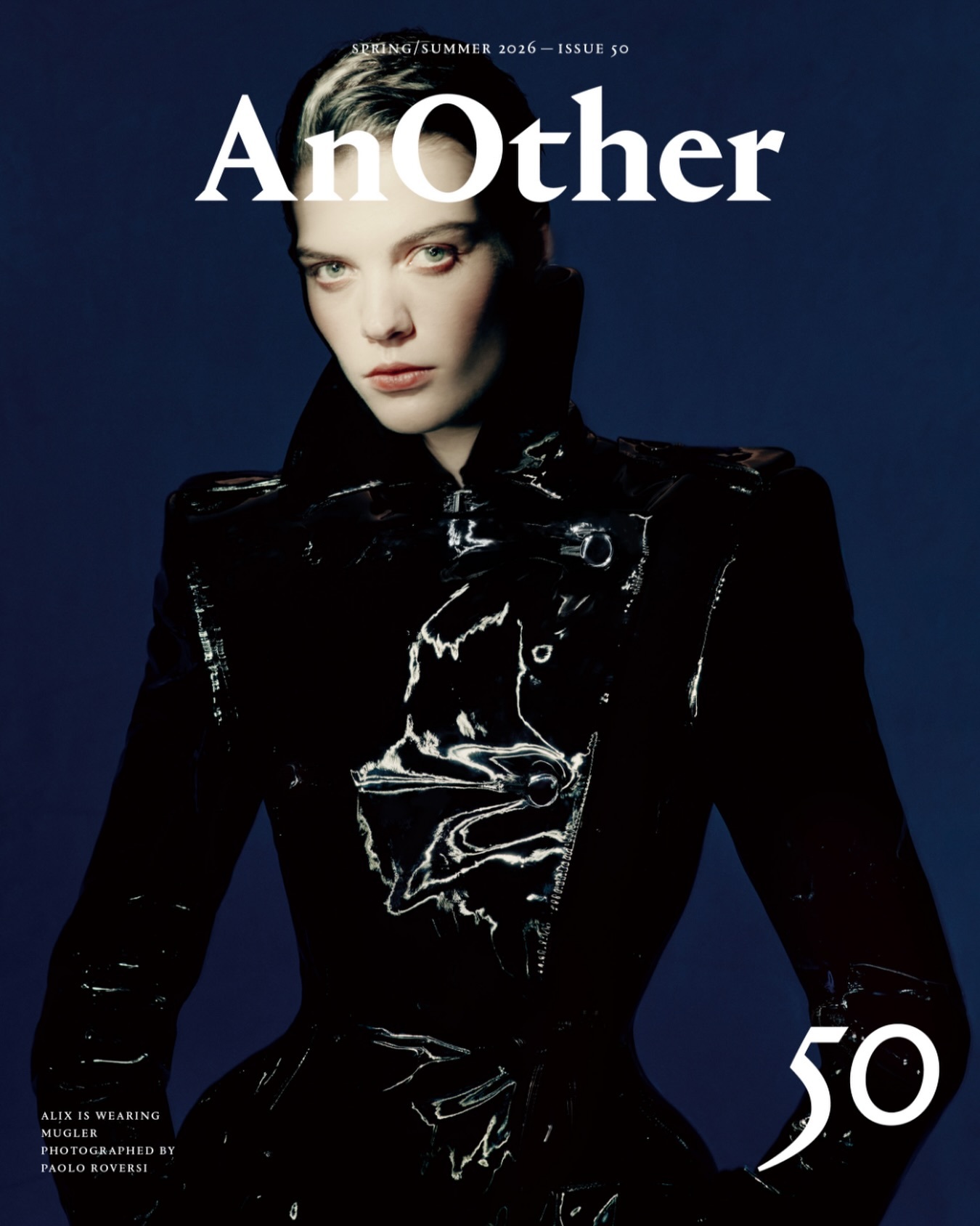 模特ALIX身穿Mugler黑色漆皮大衣出镜《AnOther》春夏新季刊,封面以冷调深蓝为基底,明暗光影落于人物的脸庞上形成视觉焦点,而漆皮大衣的利落线条与光泽自带高级质感,大大提高整个画面的观赏性,喜欢喜欢~