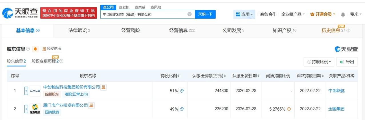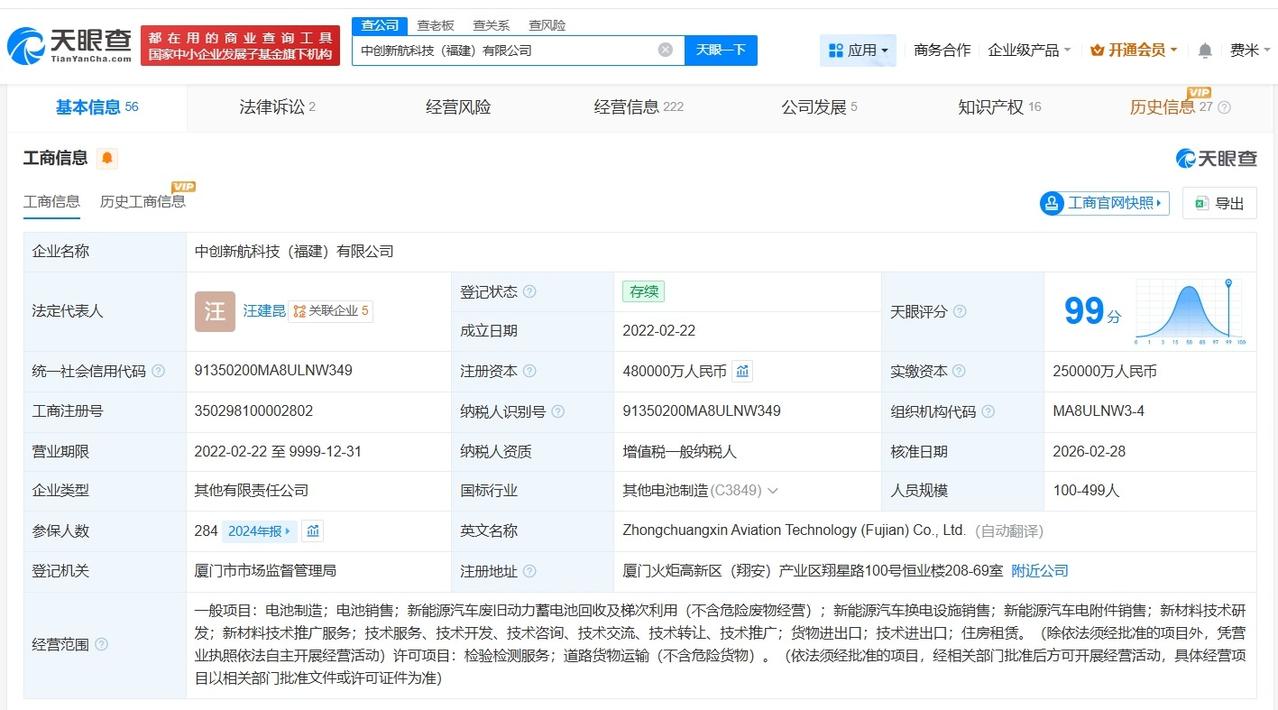 中创新航旗下福建科技公司增资至48亿 增幅约23% 天眼查App显示,近日,中创新航科技(福建)有限公司发生工商变更,注册资本由39亿人民币增至48亿人民币,增幅约23%。 中创新航科技(福建)有限公司成立于2022年2月,法定代表人为汪建昆,经营范围包括电池制造、电池销售、新能源汽车废旧动力蓄电池回收及梯次利用等。股东信息显示,该公司由中创新航(03931.HK)、厦门市产业投资有限公司共同持股。 天眼查信息: