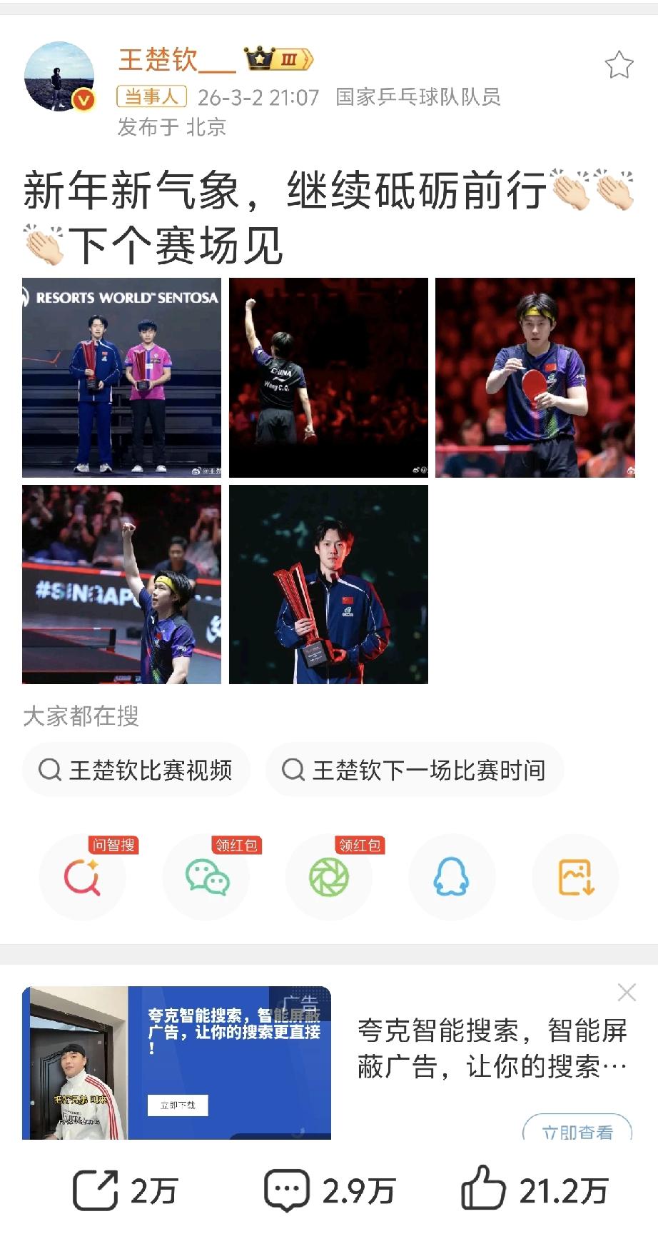 王楚钦的夺冠感想终于来了[赞][捂脸], 今晚九点多,王楚钦在自媒体简简单单发图文说,“新年新气象,继续砥砺前行👏👏👏下个赛场见 ”,这惜字如金的词句透露着王楚钦的洒脱与自信。 但这短短两行真的不能让球迷过瘾,赶快点开所附图片看看,五张图片——竟然都没有凑够整齐的六张。 王楚钦,你应该把冠军城市宣传照也放上来呀[大笑]。