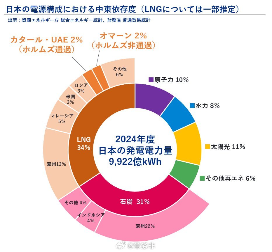日本对霍尔木兹海峡和中东的电力依赖分别约占其发电结构的2%和4%。