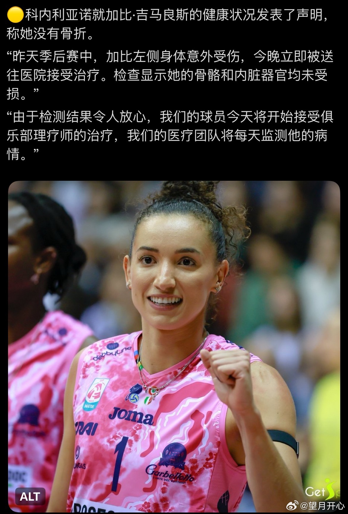 【科内关于加比伤情的官方最新回应】科内利亚诺就加比·吉马良斯的健康状况发表了声明,称她没有骨折。“昨天季后赛中,加比左侧身体意外受伤,今晚立即被送往医院接受治疗。检查显示她的骨骼和内脏器官均未受损。”