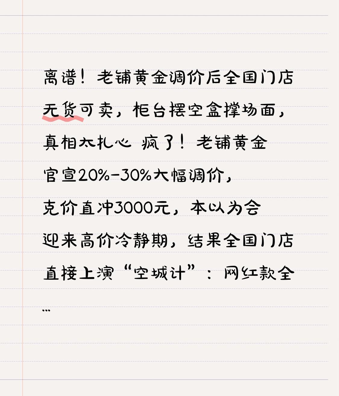 离谱!老铺黄金调价后全国门店无货可卖,柜台摆空盒撑场面,真相太扎心 疯了!老铺黄金官宣20%-30%大幅调价,克价直冲3000元,本以为会迎来高价冷静期,结果全国门店直接上演“空城计”:网红款全空、素金款断货,有的门店只能拿点钻样品填空柜,顾客到店只能看个寂寞,话题直接炸上热搜! 涨价前半个月,全国门店就被挤爆。北京SKP通宵排队,上海新天地排队超8小时,有人坐高铁跨省抢货;线上更夸张,62万的金碗、46万的金如意,上架10分钟秒空,30多款爆款直接售罄下架。大家抱着“早买早赚、越涨越买”的心态,把门店库存直接扫空。 2月28日正式涨价后,场面更尴尬:价签换完了,货却没了。王府井、成都、广州多家门店坦言:小克重网红款、素金全卖空,只剩少量大件摆件,顾客兴冲冲来,空手悻悻走,门店只剩柜台和导购,堪称“黄金版空气买卖”。 转折点来了! 这场“无货可卖”的荒诞背后,藏着三层真相。 第一,品牌周期性调价策略,年年涨、次次抢,制造“不买更贵”的恐慌,消费者疯狂囤货,直接掏空库存。 第二,国际金价大涨+非遗工艺溢价,把老铺推成“黄金奢侈品”,大家抢的不只是首饰,更是保值与面子。 第三,产能跟不上抢购速度,手工古法金制作周期长,补货遥遥无期,门店只能摆空柜硬撑。 网友吵翻了:有人调侃“店还在,黄金没了”,有人吐槽“饥饿营销玩过头”,也有人后悔没上车,一夜少赚几千上万。 这波闹剧也给所有人提了醒:黄金保值不假,但盲目追涨、为溢价买单,风险不小。抢购的是情绪,冷静下来才懂:适合自己的才最值,别被恐慌带偏,别为营销买单。 从通宵排队到门店空柜,老铺黄金的疯狂,是金价热潮的缩影。理性消费、守住钱包,不跟风、不焦虑,才是最稳的理财。 你会为高价黄金买单吗?评论区聊聊,点赞转发,提醒身边人理性购金!