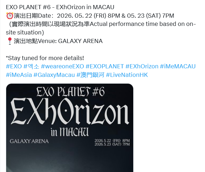 EXO澳门演唱会官宣,5月22日&23日Comingsoon!
