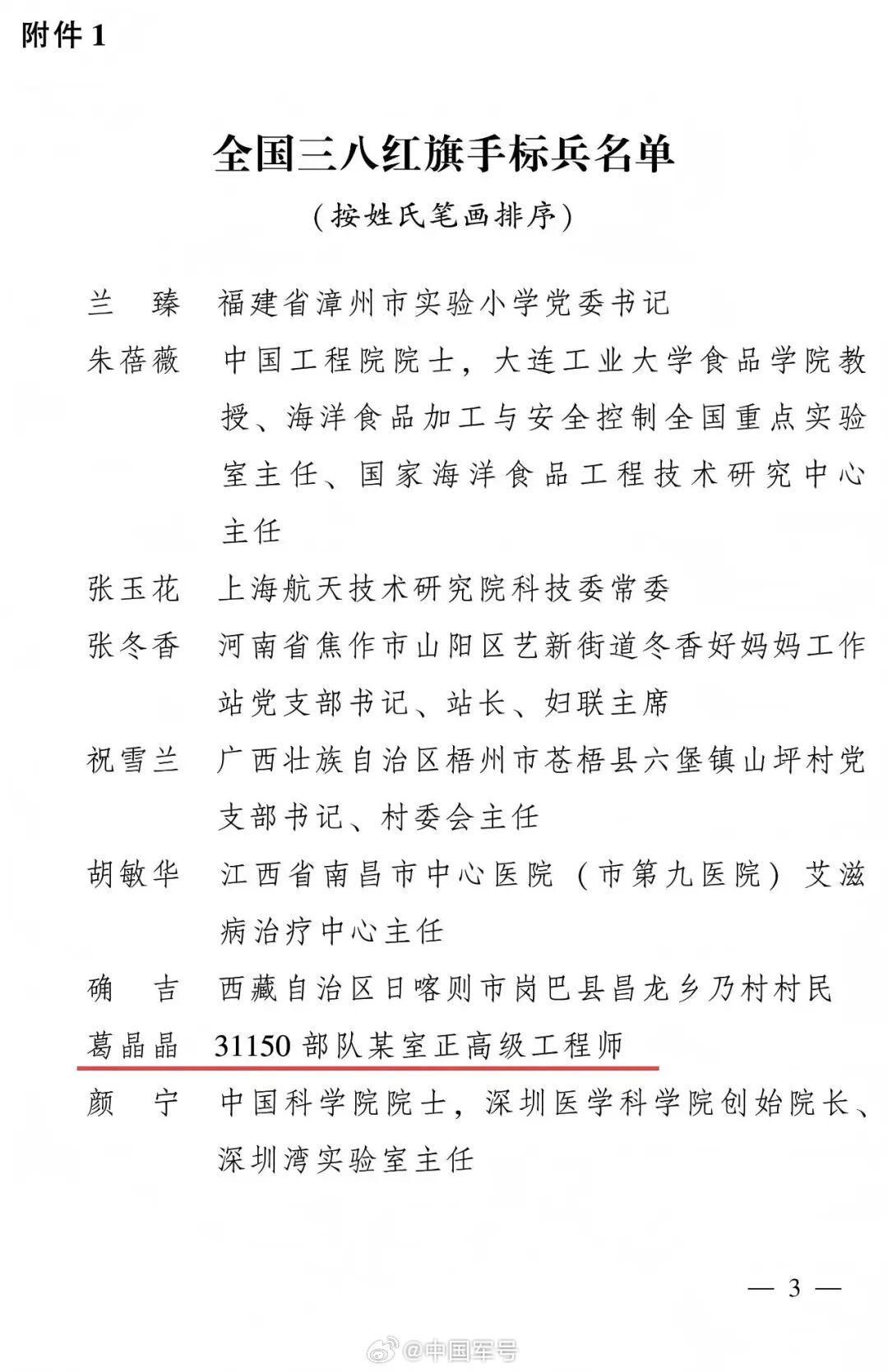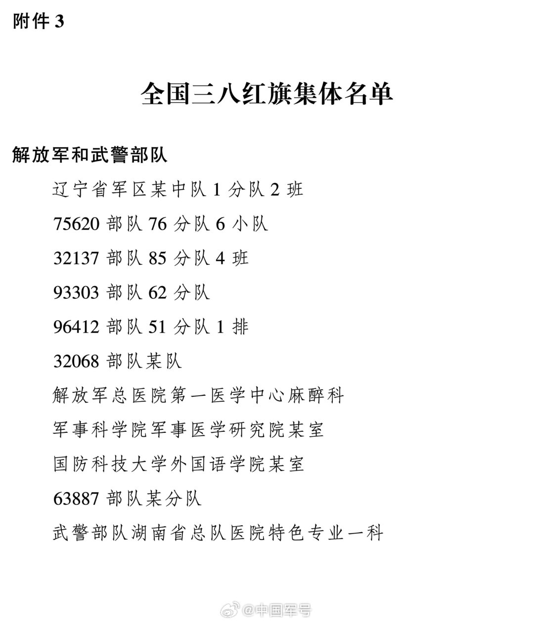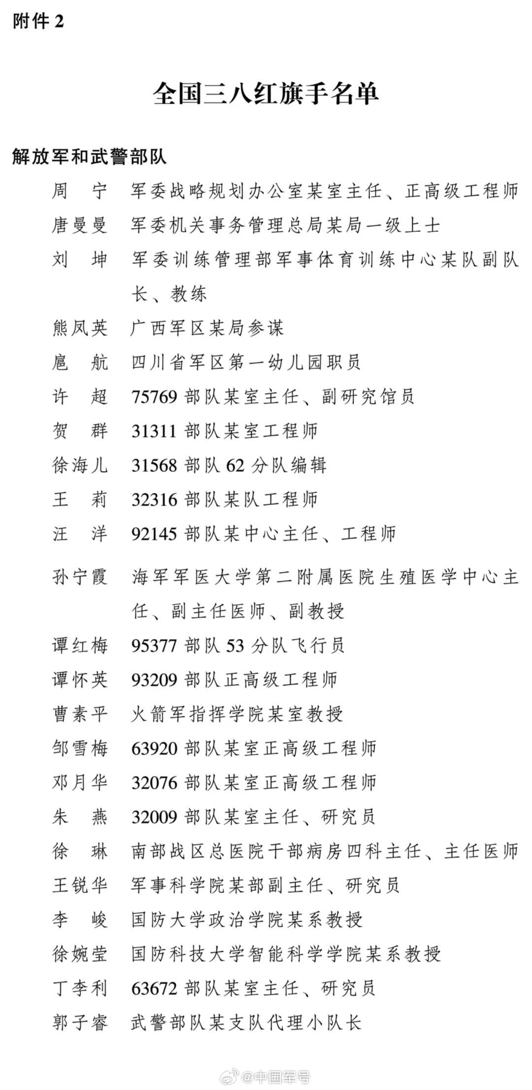 【致敬!598名女性获全国三八红旗手称号】今天,全国妇联在京举行纪念三八国际妇女节暨表彰大会。大会表彰了9名全国三八红旗手标兵、598名全国三八红旗手、400个全国三八红旗集体、600个全国巾帼文明岗。解放军和武警部队表彰名单如下↓↓为她们点赞!(央视新闻)