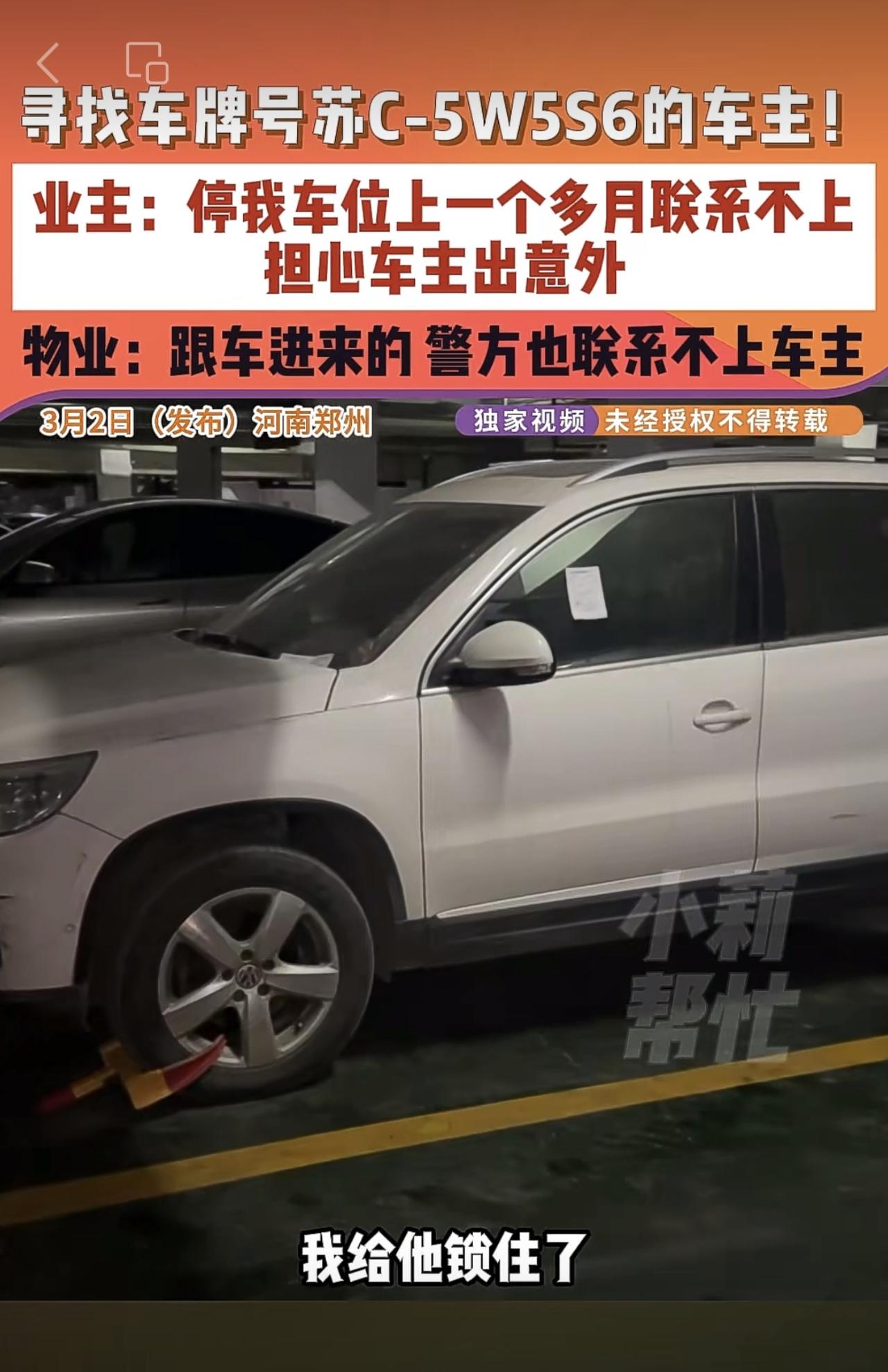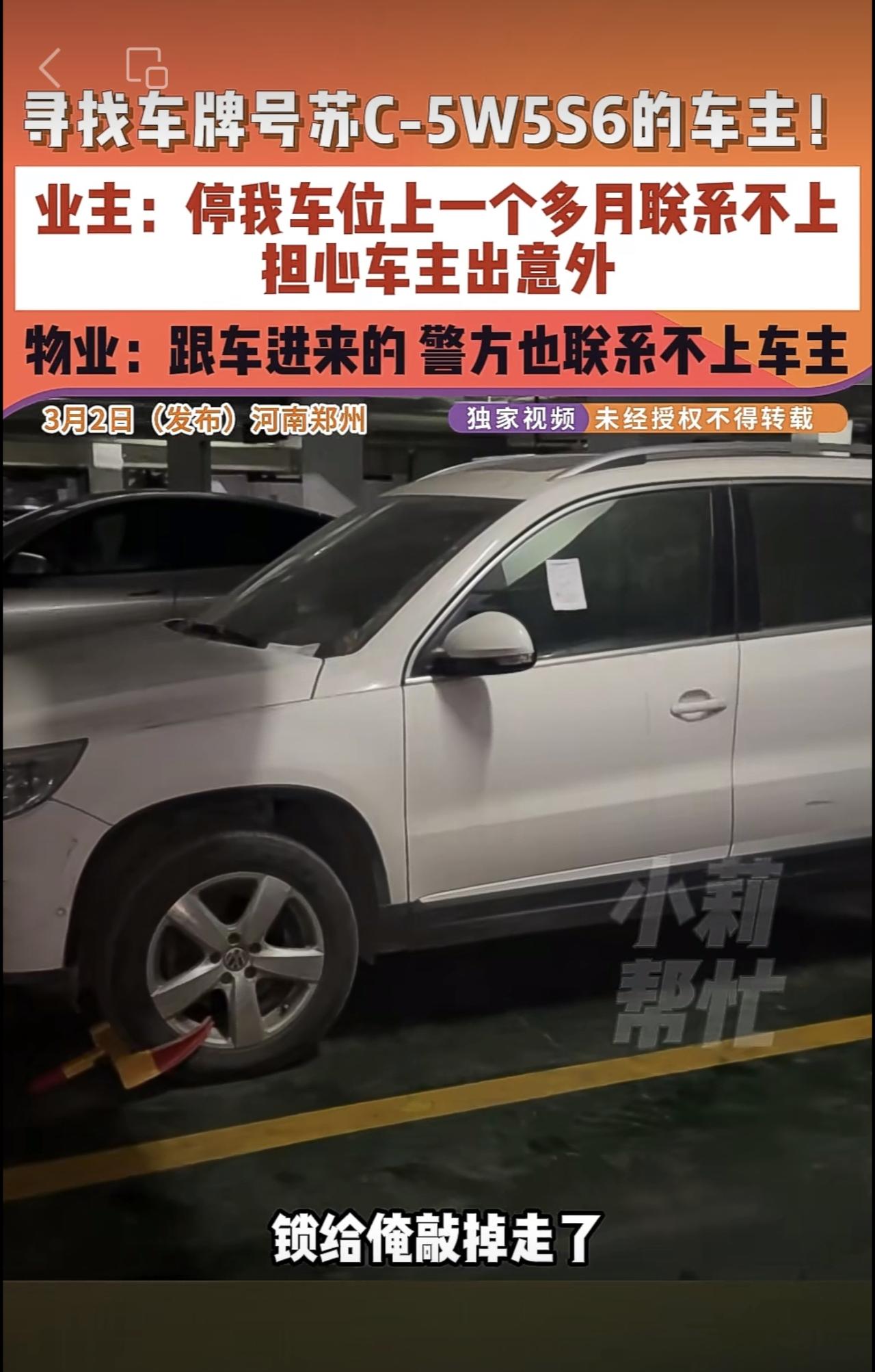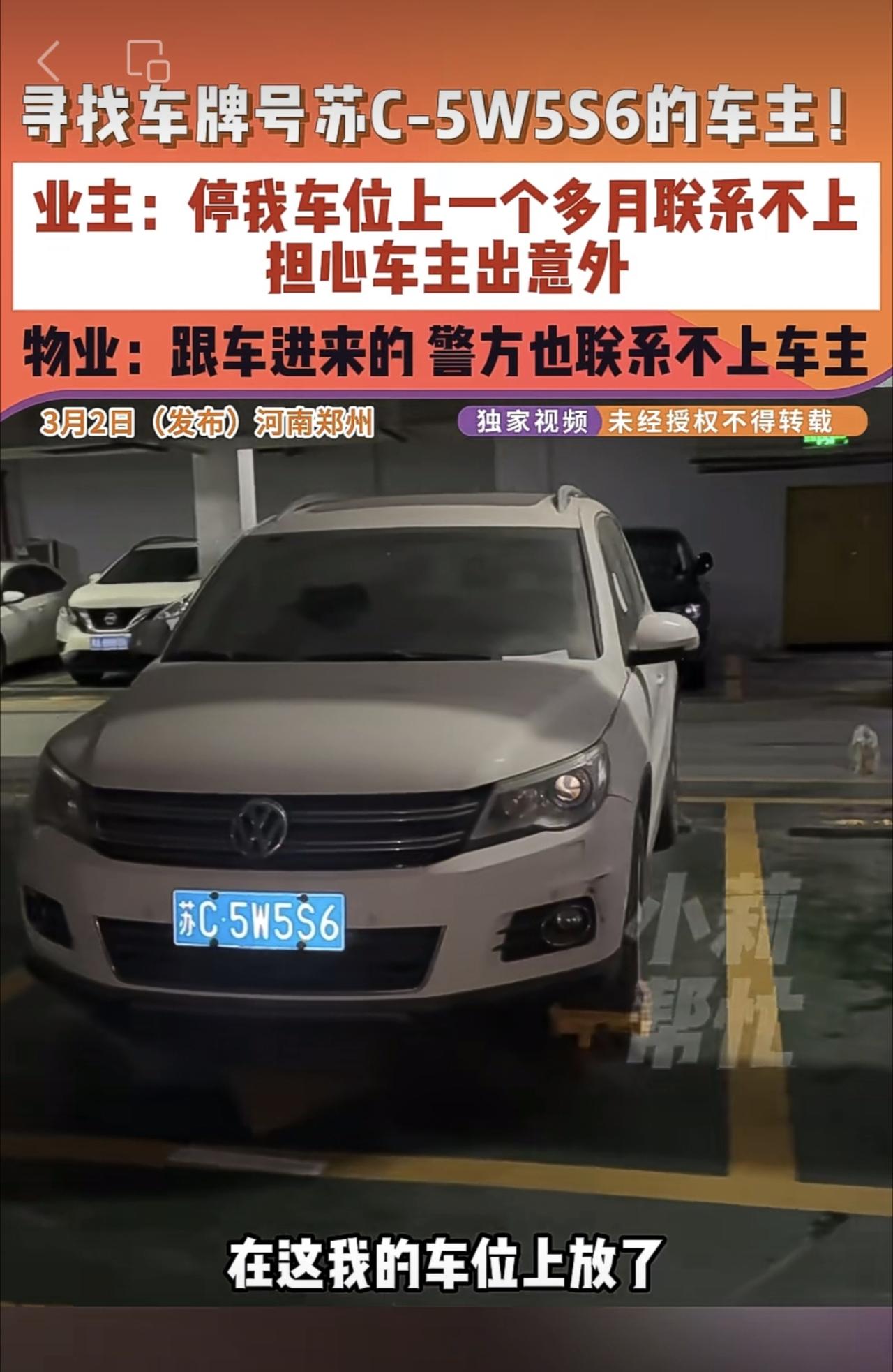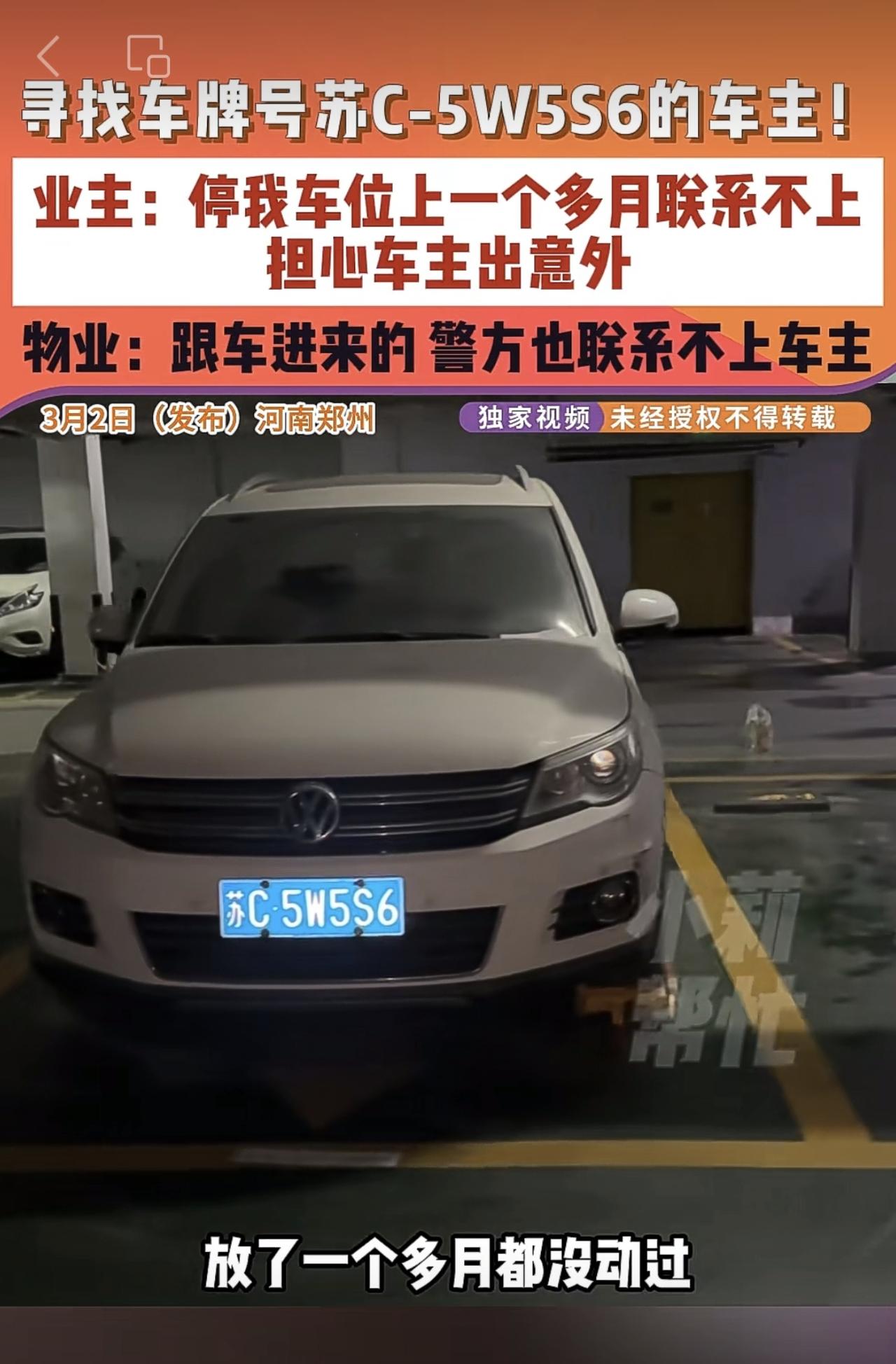 3月2日(发布)河南郑州,寻找车牌号苏C-5W5S6的车主!业主:停我车位上一个多月联系不上,担心车主出意外,物业:跟车进来的 警方也联系不上车主。