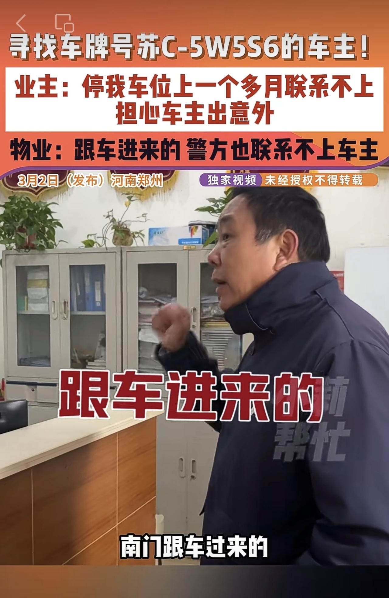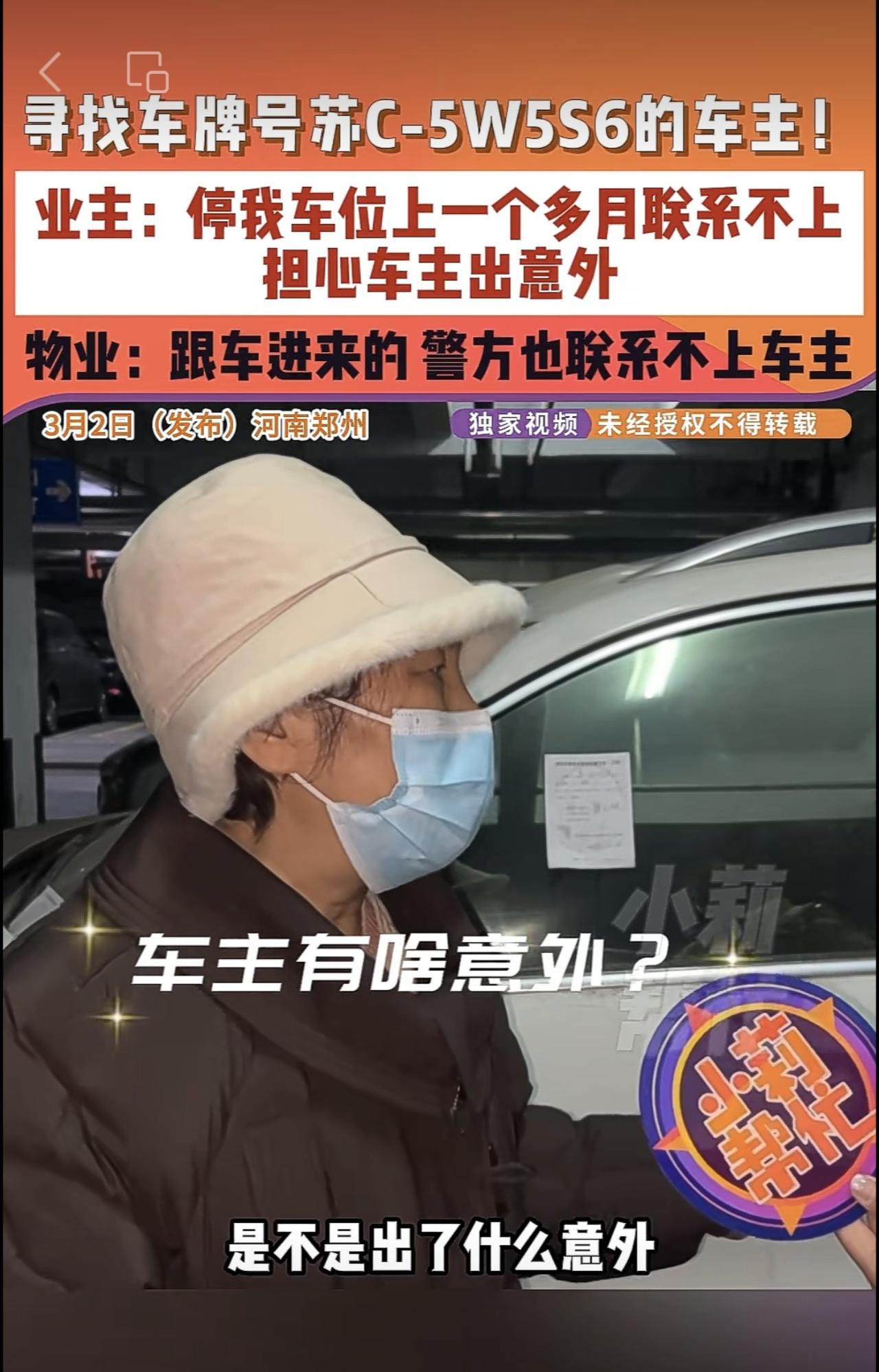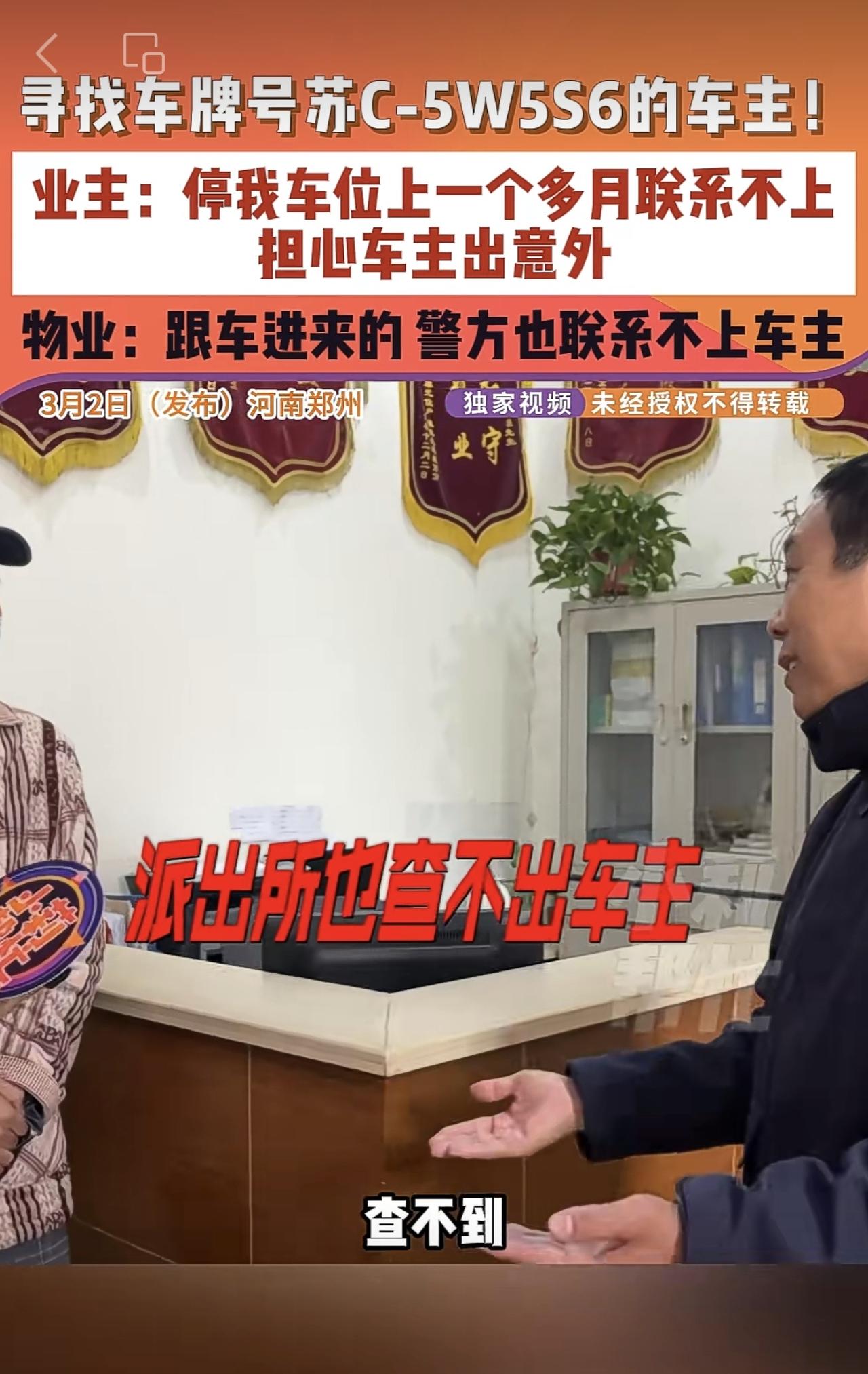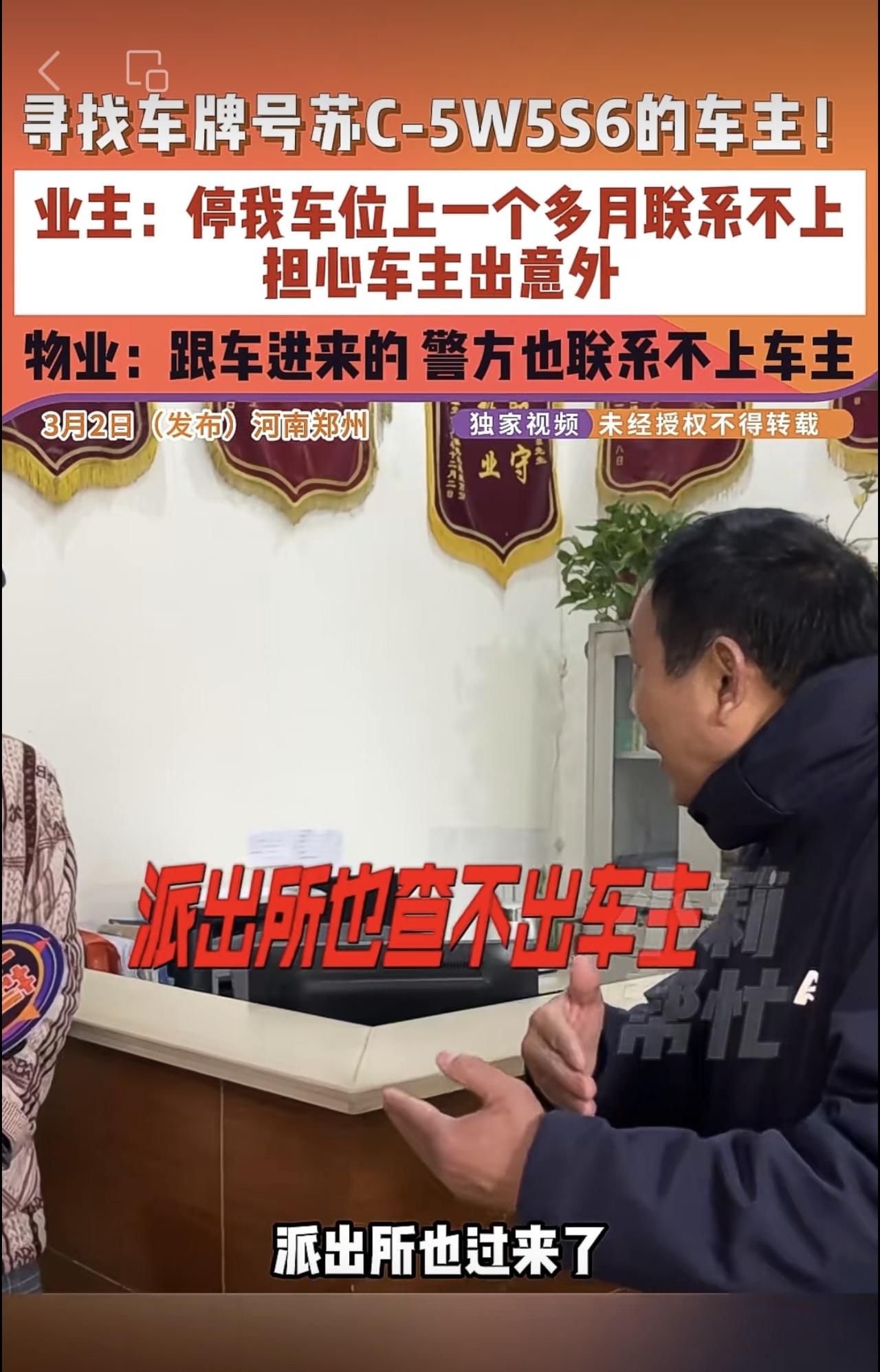 3月2日(发布)河南郑州,寻找车牌号苏C-5W5S6的车主!业主:停我车位上一个多月联系不上,担心车主出意外,物业:跟车进来的 警方也联系不上车主。