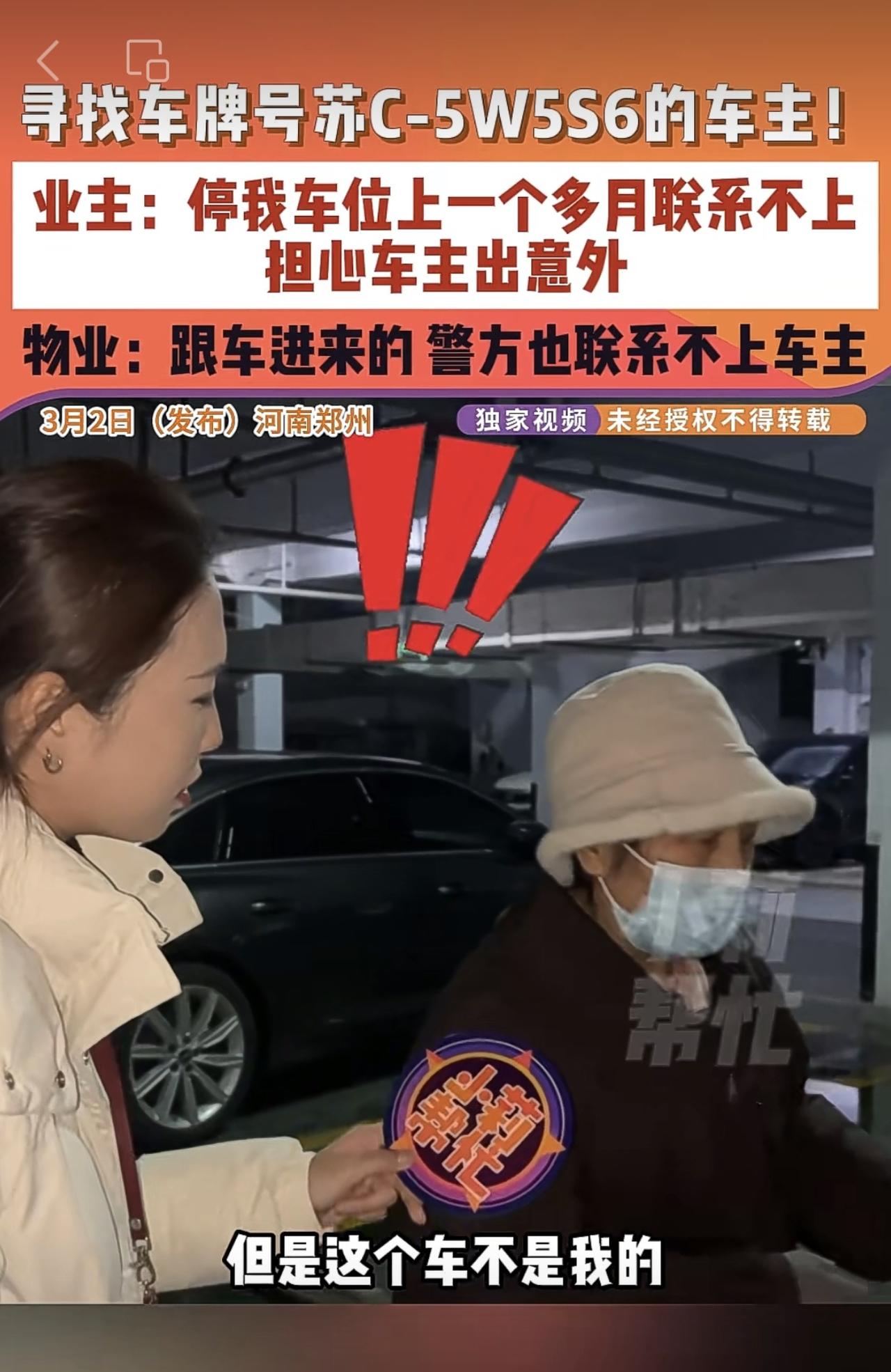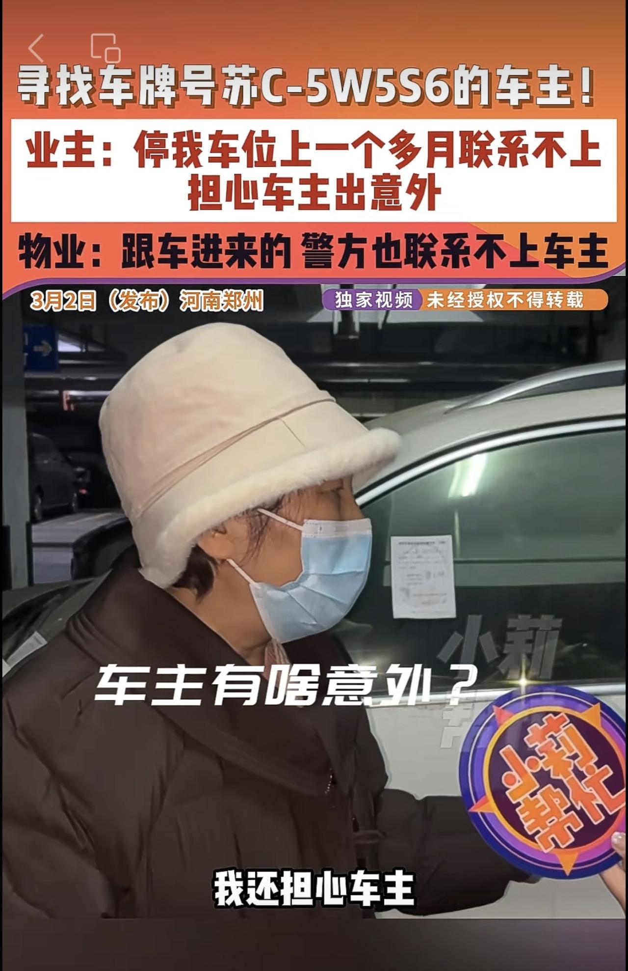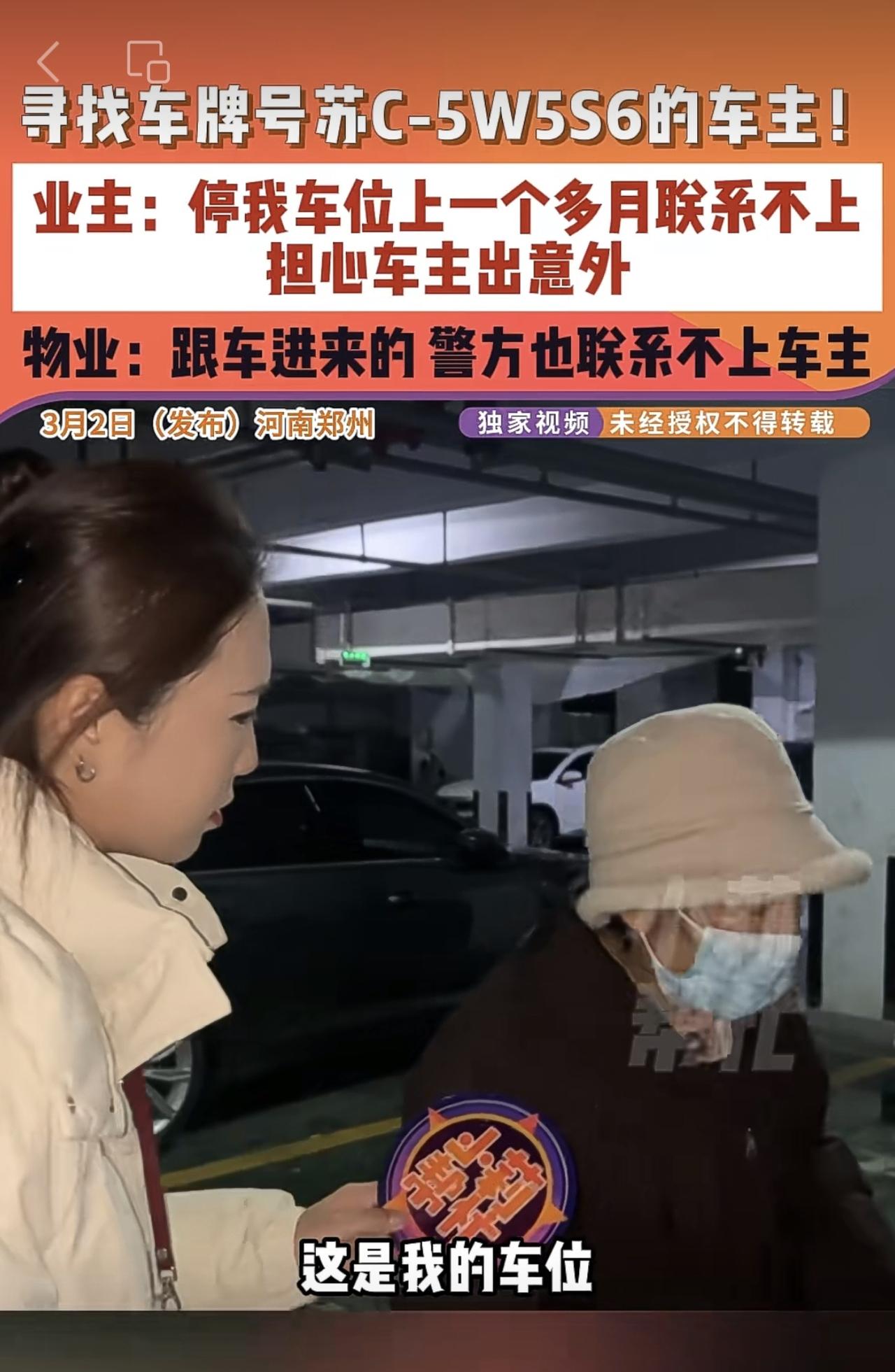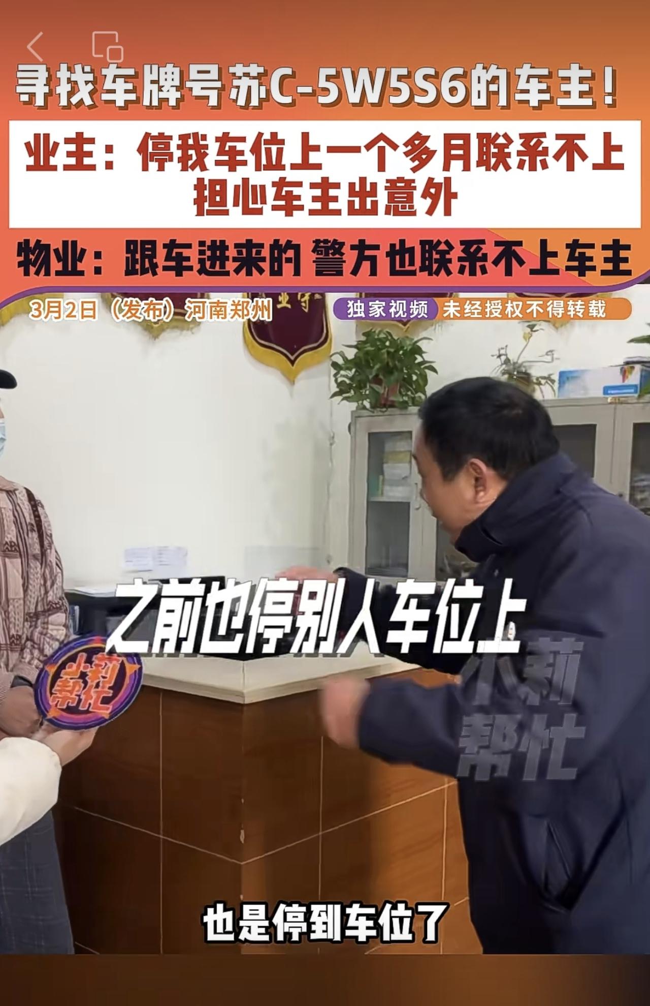 3月2日(发布)河南郑州,寻找车牌号苏C-5W5S6的车主!业主:停我车位上一个多月联系不上,担心车主出意外,物业:跟车进来的 警方也联系不上车主。