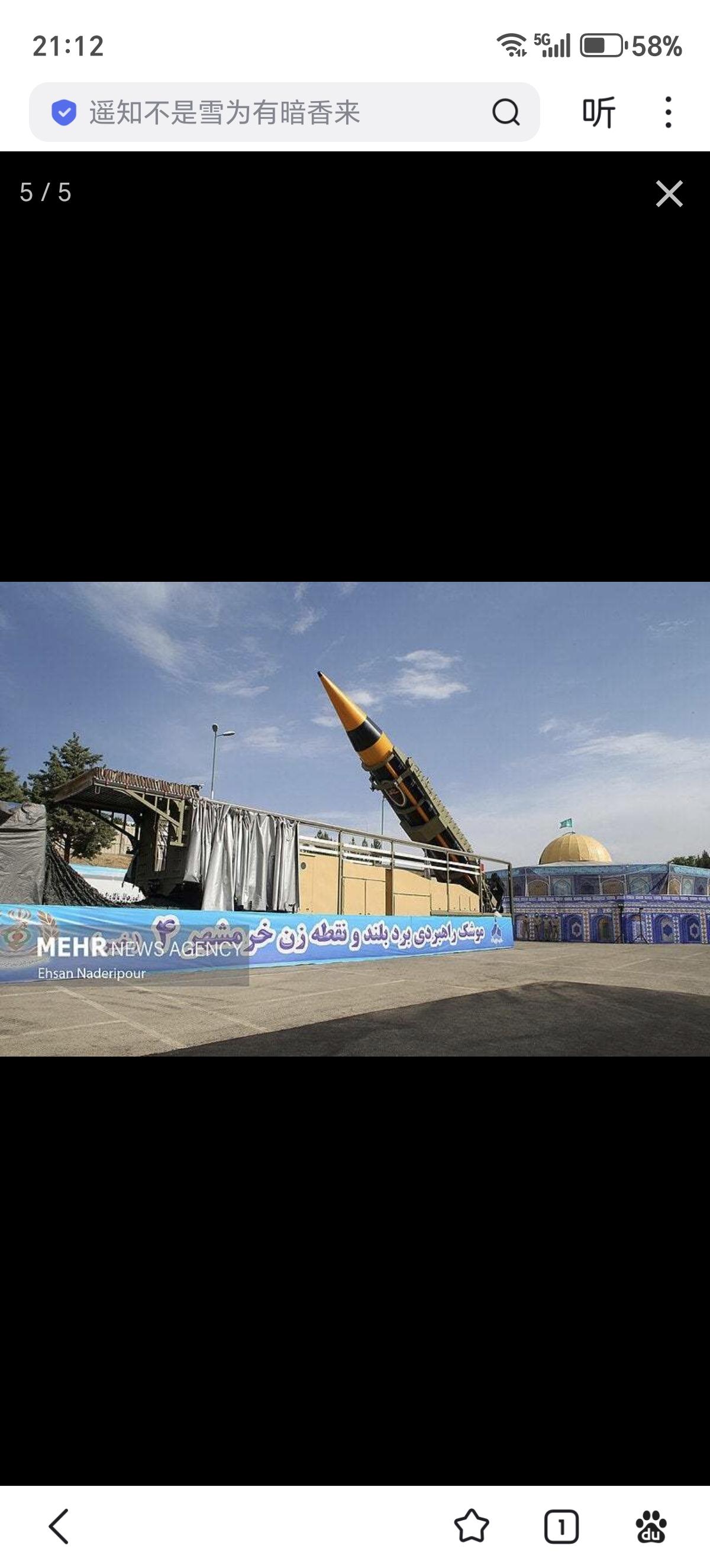 据伊朗媒体2日报道,伊朗伊斯兰革命卫队发布第9号公告说,动用“霍拉姆沙赫尔-4”弹道导弹发动第十波攻势,打击以色列特拉维夫、海法等地目标。公告说,伊朗伊斯兰革命卫队针对美国和以色列的“真实承诺-4”第十波攻势,动用“霍拉姆沙赫尔-4”弹道导弹发动打击,目标包括以色列特拉维夫政府大楼、位于以色列海法的军事和安全中心以及东耶路撒冷。以色列则发布视频疑似击毁了2枚该导弹。 “霍拉姆沙赫尔-4”/“海巴尔”是伊朗武器库中最具能力的远程弹道导弹之一。最初的“霍拉姆沙赫尔”于2017年首次公开亮相,据评估它至少部分源自朝鲜的“火星-10”,也称为BM-25“舞水端”,这是一种固体燃料中程弹道导弹,声称射程约为2000千米。与液体燃料弹道导弹相比,固体燃料类型通常发射更快、更容易,减少了对手在发射前击毁它们的可能性。此后伊朗又公布了额外的“霍拉姆沙赫尔”改型,其中最新的是于2023年首次公开亮相的“霍拉姆沙赫尔-4”/“海巴尔”,伊朗霍拉姆沙赫尔4远程弹道导弹。长度约13米,直径约1.5米,重量约30吨,射程为2000千米,配备重达1500千克的长约4米的弹头。精度10至30米CEP。该导弹最大飞行速度可达16马赫,大气层内飞行速度也超过8马赫,