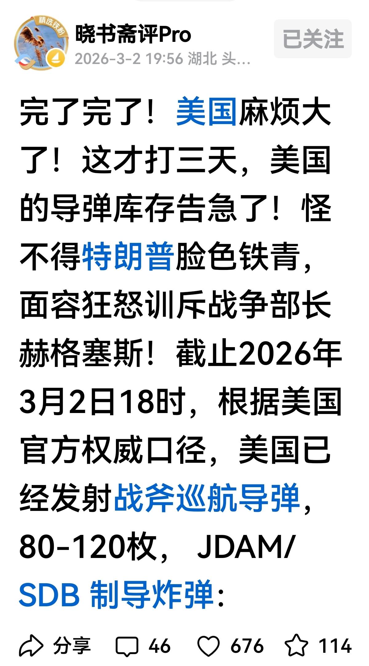【伊朗,还能坚持多久?】 沈逸开战前所谈弹药数量问题,还真的成为热门话题,有人说完了,完了,美军战斧导弹数量告急? 苑举这位教授刚被打脸,曾经预测美国不敢打,现在又出来说,这次开火给我们二十年窗口期,也就是说打与不打,我们都赢。 随着哈梅内伊的继任者,接连出事,人们发出疑问:伊朗还能支持多久? 有人担心伊朗可能变天,我们做好最坏打算!