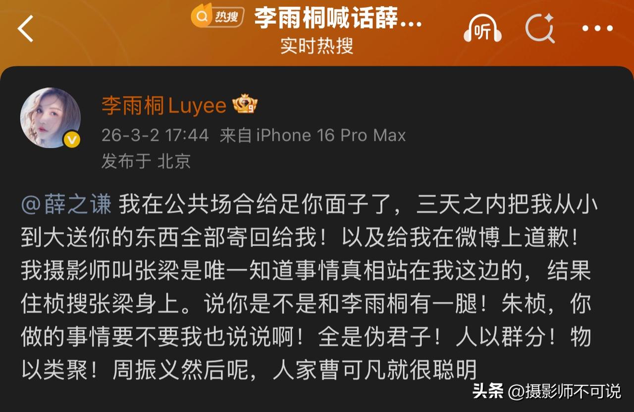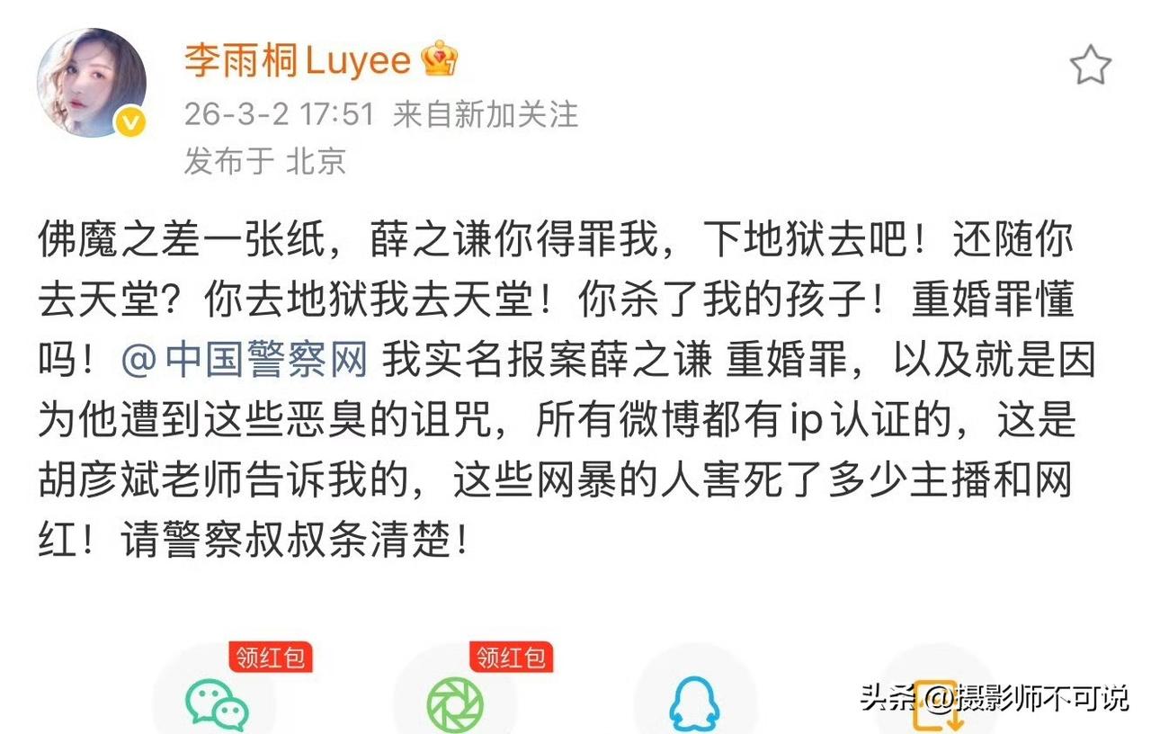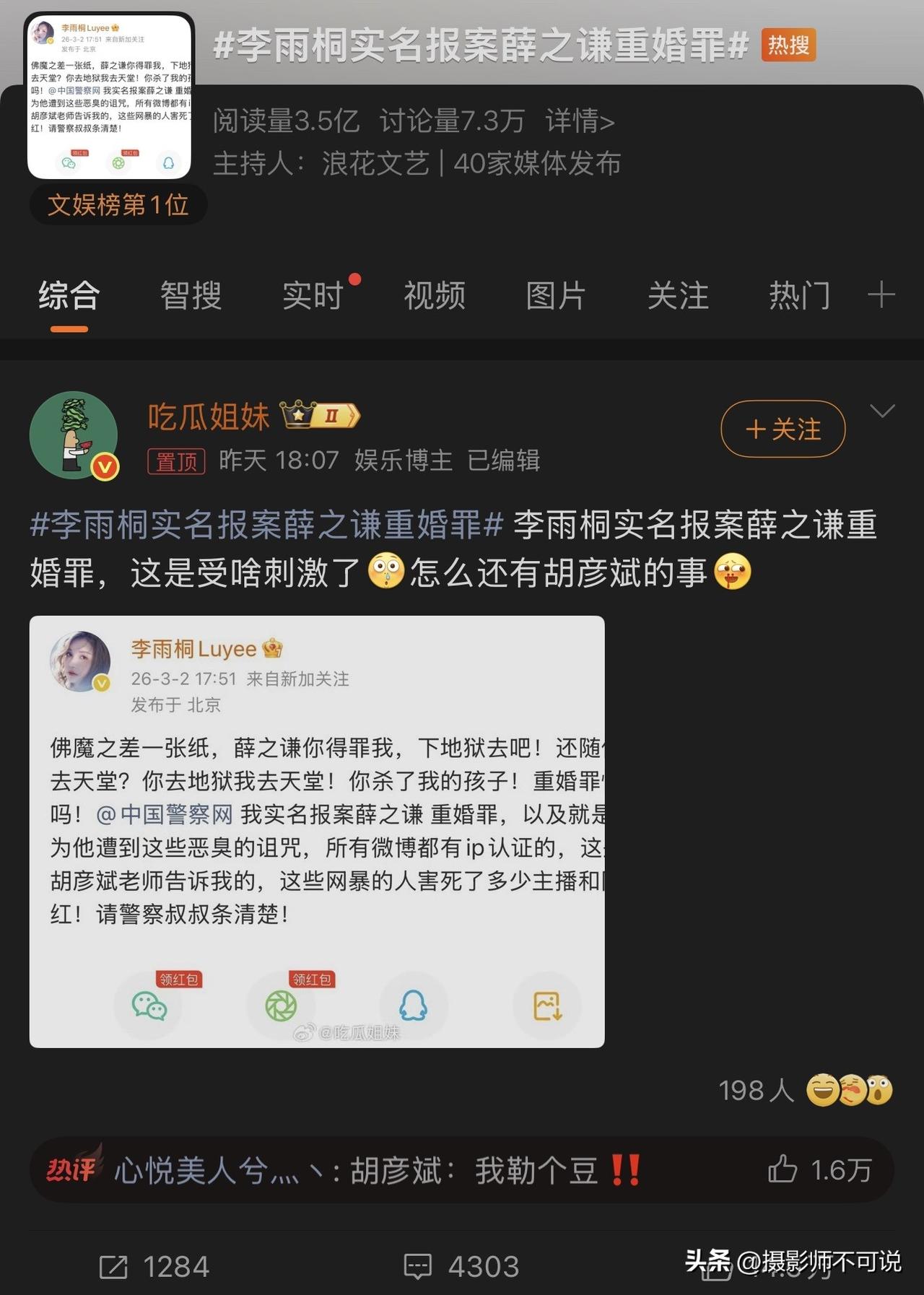 李雨桐实名举报薛之谦重婚突然火了,有多少人和我一样第一眼把李雨桐看成了李一桐?心想李一桐什么时候和薛之谦杠上了?这可是超级大瓜啊!后来定睛一瞧原来是李雨桐而不是李一桐,这姐们儿是一位百万粉丝大V,估计也是经常混明星圈儿的,所以在其疑似举报博文中不但提到了薛之谦,还提到了胡彦斌。不过评论区很多网友并不买账,认为你实名举报重婚罪不是应该先去相应的国家机关吗?怎么现在社交账号变成了实名举报的优先场所了?想想也是,如果对方不是薛之谦,而是路人甲谁谁谁,她还会在社交账号上实名举报吗?现在正是中东大乱的时候,该热搜居然短时间压过了中东的热搜,阅读量居然达到了3.5亿,可见其影响力之大,剧情之狗血。我等吃瓜群众先不预设立场,万一是炒作呢?咱们就坐等水落石出吧!