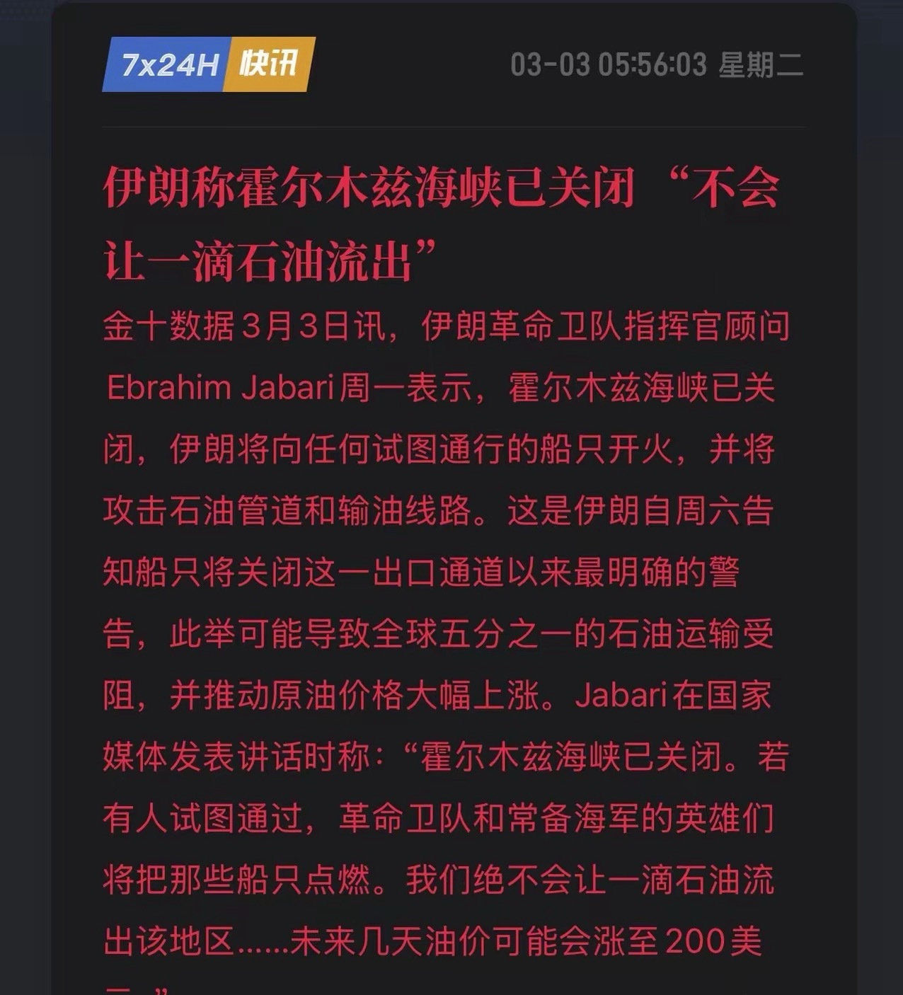 刚刚,伊朗彻底“掀桌子”!霍尔木兹海峡正式关闭:敢过就烧船,全球五分之一石油断供!中东核爆级消息! 3月3日,伊朗革命卫队高层Ebrahim Jabari发出最后通牒:“霍尔木兹海峡已关闭!任何试图通行的船只都将被点燃,绝不会让一滴石油流出。这已是战争宣言!此前伊朗仅口头警告,而此次是官方实锤确认封锁。更可怕的是,伊朗不仅封海,还扬言要炸毁区域内的石油管道和输油线路。这意味着中东石油外输的海陆双通道面临全面瘫痪。全球市场瞬间休克,供应断崖——全球20%的石油运输大动脉被切断,每日数百万桶原油无法运出。油价狂飙,能源危机阴影瞬间笼罩欧美亚三大洲。通胀噩梦——油价是百价之基,这一把火将直接点燃全球通胀。乱世买资源,危局囤能源!资金将疯狂涌向以下板块:石油巨头:中国海*、中国石*。油运龙头:中远海*、招商轮*,航线中断导致运力极度稀缺,运费有望翻倍,业绩弹性惊人。替代能源:煤炭、天然气及新能源板块将成为资金避险的首选。深度警示,霍尔木兹海峡的封锁若持续,将重塑全球能源格局。对于投资者而言,这是十年难遇的周期大机会!高油价时代已强行开启,你手中的筹码够硬吗?