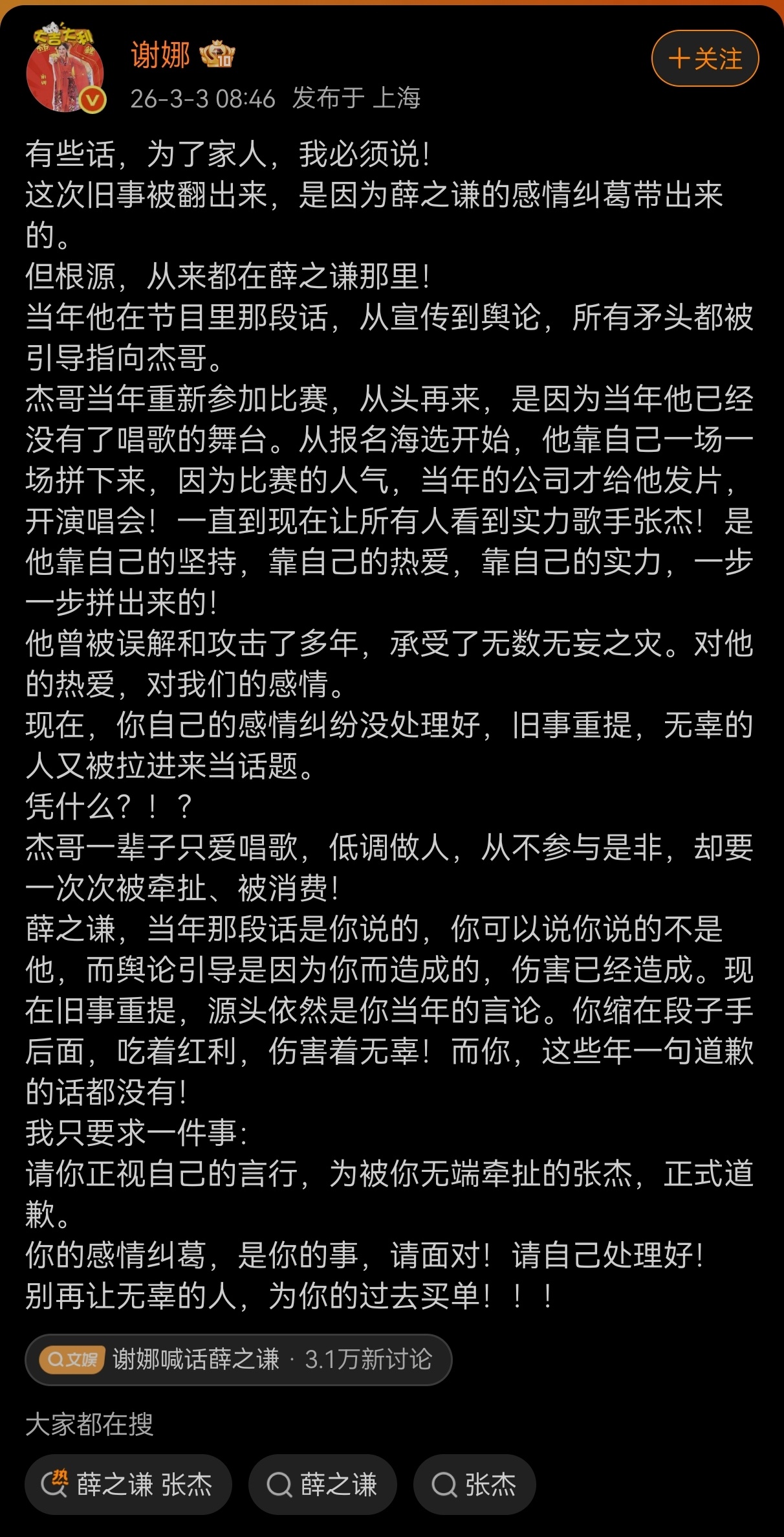 秦岭笑谈谢娜喊话薛之谦谢娜要求薛之谦向张杰道歉薛之谦 张杰3月3日,谢娜发长文喊话薛之谦,为丈夫张杰发声。谢娜表示,此次旧事重提,源于薛之谦感情纠葛发酵,却让张杰无辜被牵连。她回顾张杰当年从零开始,靠实力一步步重回舞台,却因薛之谦早年言论被误解攻击多年。谢娜直指,伤害已成且多年未获道歉,如今旧事再被翻出源头仍在对方。她正式要求薛之谦正视言行,向无端被牵扯的张杰公开道歉,别让无辜者为其过往买单。据悉,起因是薛之谦早年节目疑似内涵张杰,近日李雨桐再提及相关争议,引发此次风波。李雨桐喊话薛之谦