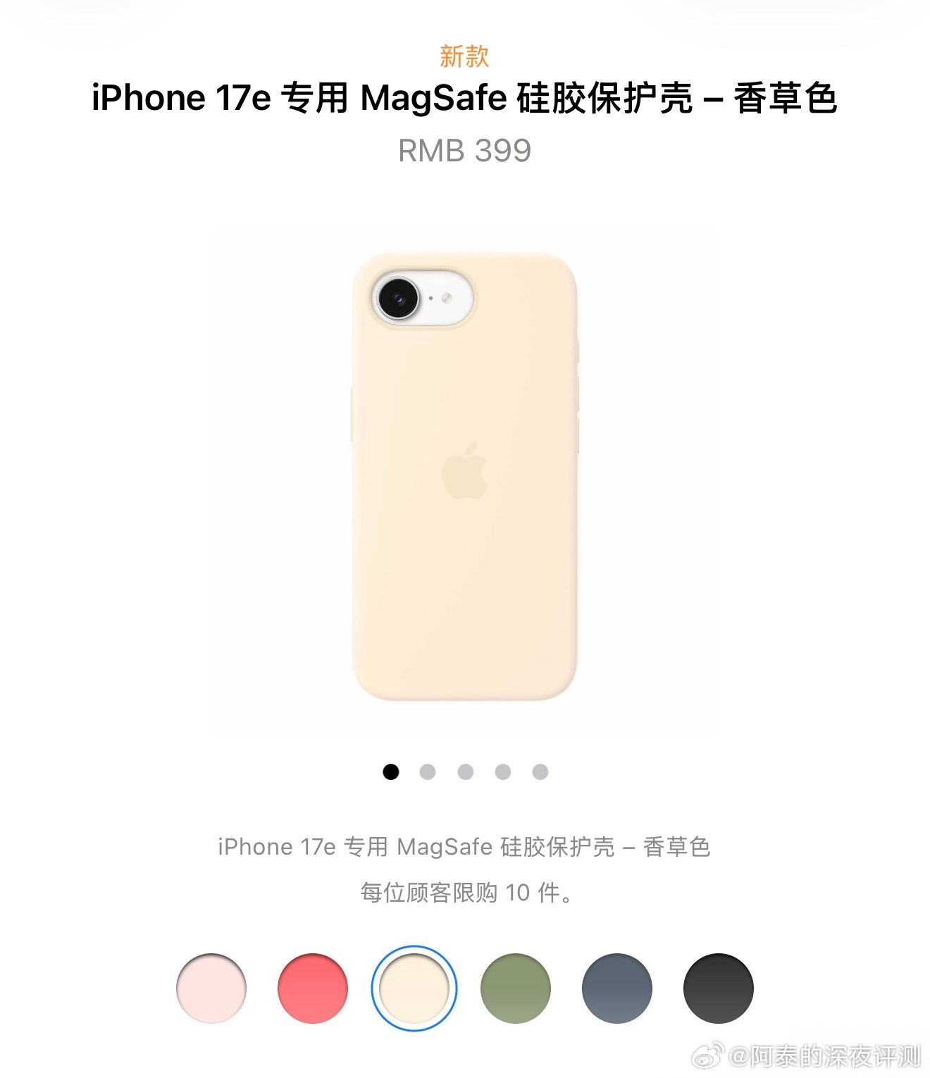 iPhone 17e 专用 MagSafe 硅胶保护壳可选浅粉色、亮番石榴粉色、香草色、浅苔绿色、铁锚蓝色、黑色六种配色,兼容各种 Magsafe / Qi2 配件,售价 399 元。新配色斜挎挂绳应 iPhone 17e 保护壳发布而上新了浅粉色、亮番石榴粉色,售价 479 元。