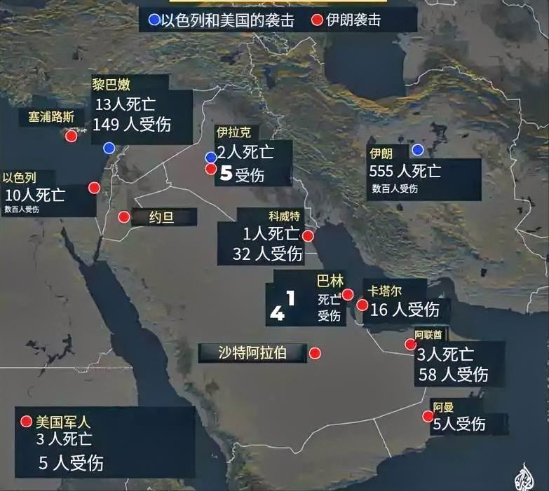 这是美以和伊朗发动跨境袭击之后,12个遭受袭击国家的已确认的伤亡人数。由于局势迅速变化,所有数据会随着更多信息的获取而更新。 以色列美国的袭击(蓝色标记)造成的伤亡: 伊朗:555人死亡、数百人受伤,是本次冲突中伤亡最惨重的地区。 黎巴嫩:13人死亡、149人受伤 伊拉克:2人死亡 伊朗的袭击(红色标记)造成的伤亡: 以色列:10人死亡、数百人受伤 美国军人:3人死亡、5人受伤 阿联酋:3人死亡、58人受伤 科威特:1人死亡、32人受伤 巴林:1人死亡、4人受伤 伊拉克:5人受伤 卡塔尔:16人受伤 阿曼:5人受伤