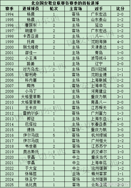 国安在职业联赛各赛季首球共有27名球员完成,13名外援,14名国内球员(还有一球是对方的乌龙)。32个赛季国安24次在联赛首轮完成赛季首球,7次在联赛第二轮完成赛季首球,1次在第五轮完成赛季首球。2025赛季法比奥攻入联赛的首粒进球,是球队近6个赛季首次由外援攻入联赛赛季首球,上一次是2019赛季,奥古斯托在客场面对武汉,攻入赛季联赛首球。大格、伊尔马兹、杨晨和李磊都曾连续两个赛季完成球队在联赛的首球。