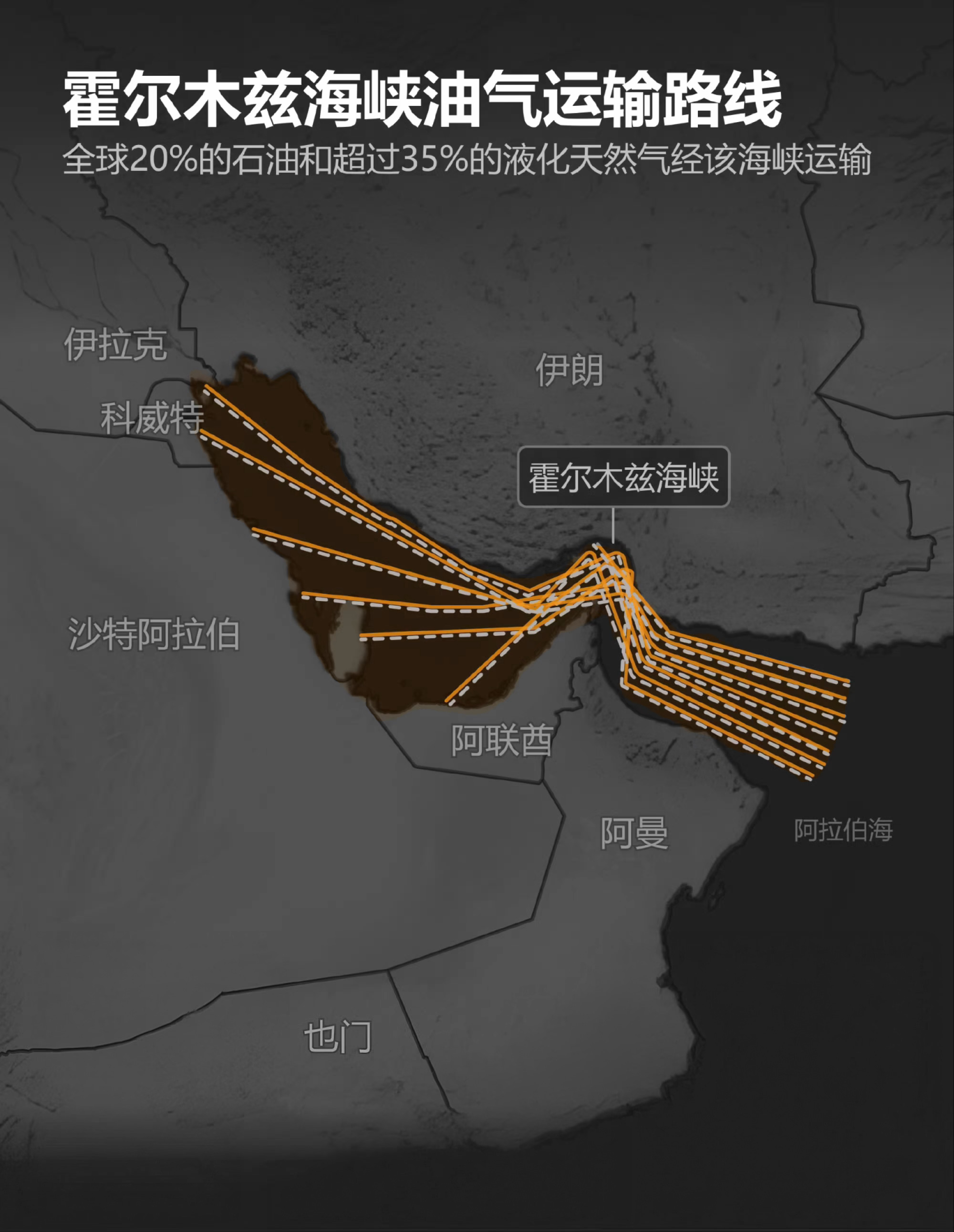 霍尔木兹海峡连接波斯湾和阿曼湾,是沙特阿拉伯、伊拉克、卡塔尔、阿联酋等中东产油国的原油出口必经之路,通过这一海峡运输的石油约占全球石油运输总量的五分之一。