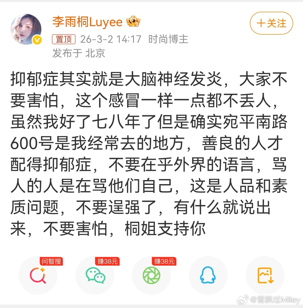 李雨桐善良的人才配得抑郁症李雨桐在置顶微博中称:“抑郁症是大脑神经发炎,像感冒一样不丢人”,并强调“善良的人才配得抑郁症”,呼吁患者“不要在乎外界语言”。自称因薛之谦的威胁与纠缠患12年抑郁症,体重暴跌至60斤,且多次提及“宛平南路600号”(上海精神卫生中心地址)的就诊经历。不知道为什么突然开始旧事重提,连续两天了,现在连谢娜都发文了。