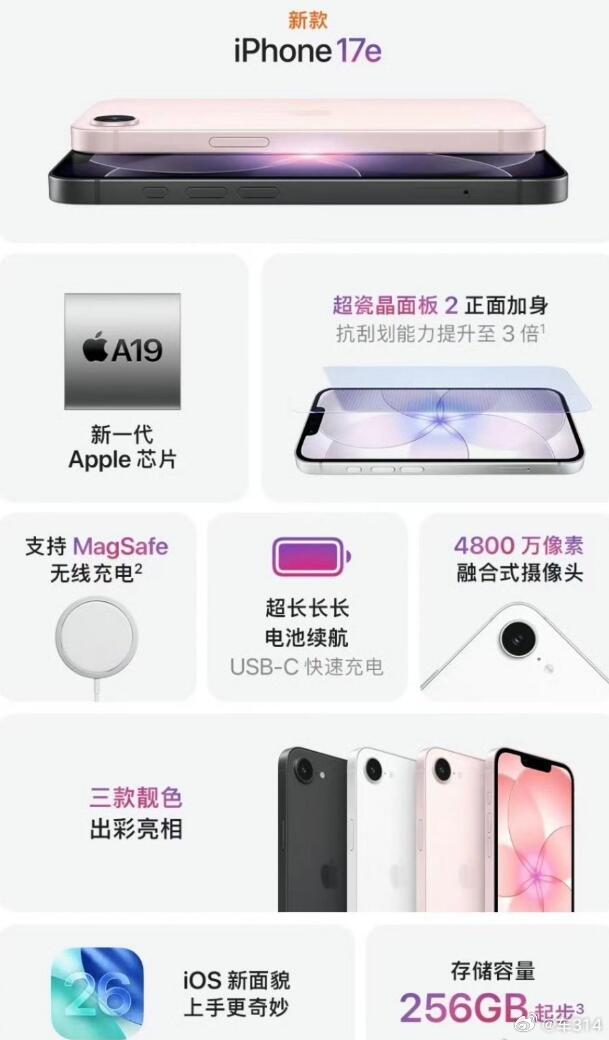 话说,iPhone 17e官方定价才4499元,补贴之后能到3999元,算不算真香呢?虽然比标准版和Pro之类的便宜不少,但你要接受的就是大刘海屏幕,只有一个4800万像素镜头,A19芯片也是残血的,存储从128GB升级到了256GB,反正是够用,但肯定谈不上夯。关键是,今年国产手机也要涨价了,你会选更贵的国产手机呢,还是会选4000元的苹果呢?iPhone最便宜新机来了iPhone17e浅粉色 苹果手机