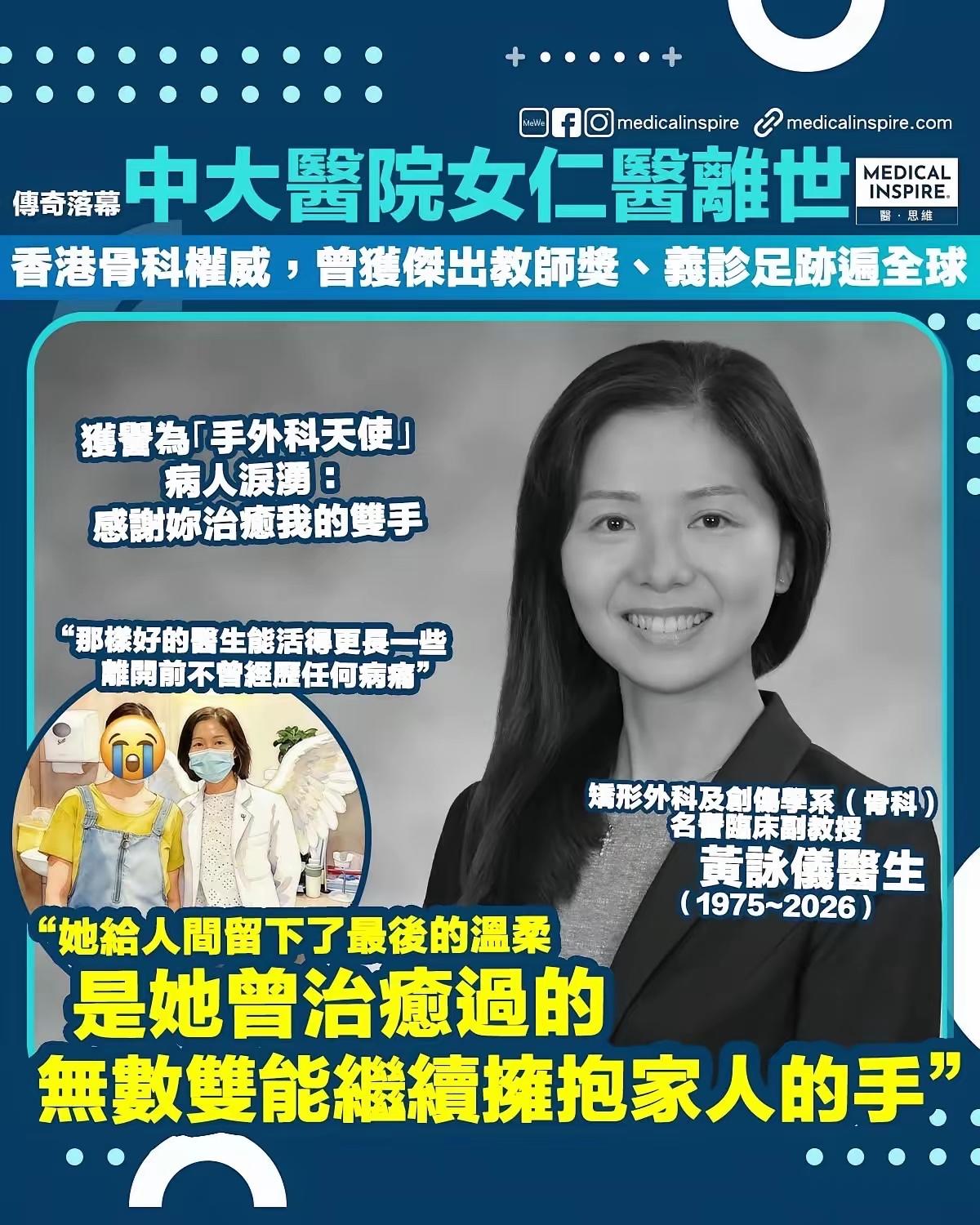 2026年2月底,香港传来揪心消息,被大家称作手外科天使的黄咏仪医生,永远离开了我们。 一位医术精湛、备受尊敬的良医离去,看着病人们的留言,我久久不能平静。 她不只在显微镜下接好断裂的神经与血管,更帮无数绝望的人,重新拾起活下去的希望。 最打动我的,从不是她的荣誉与头衔,而是她藏在骨子里的善良。 汶川地震,她逆行而上; 阿富汗战地,她以无国界医生身份,在废墟中守护生命。 即便病重时,她也总笑着安慰别人,不愿给旁人添一点麻烦。 这世上最珍贵的从不是技术有多高明,而是一颗愿意为陌生人奔赴的心。 她走了,但那些被她治愈的手、那些重新拥抱生活的人,都是她留在人间最暖的痕迹。