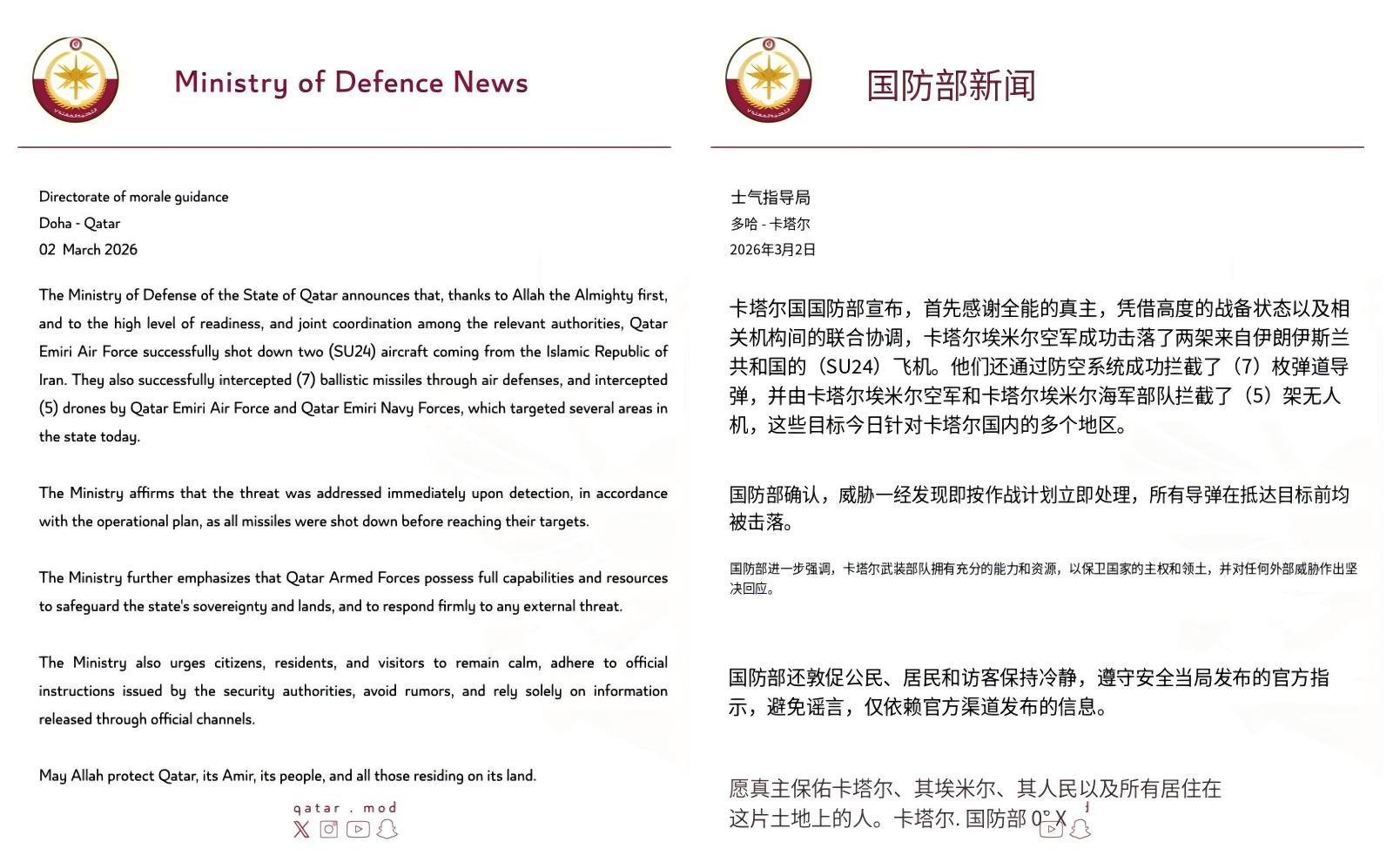 根据卡塔尔国防部公布的消息,3月2日,卡塔尔方面击落了2架靠近卡塔尔领空的伊朗苏-24战斗机。话说,在装备性能落后那么多的情况下,伊朗战机都敢出国企图跑到200公里外的卡塔尔上空作战了,可以看到伊朗空军还是很勇的。