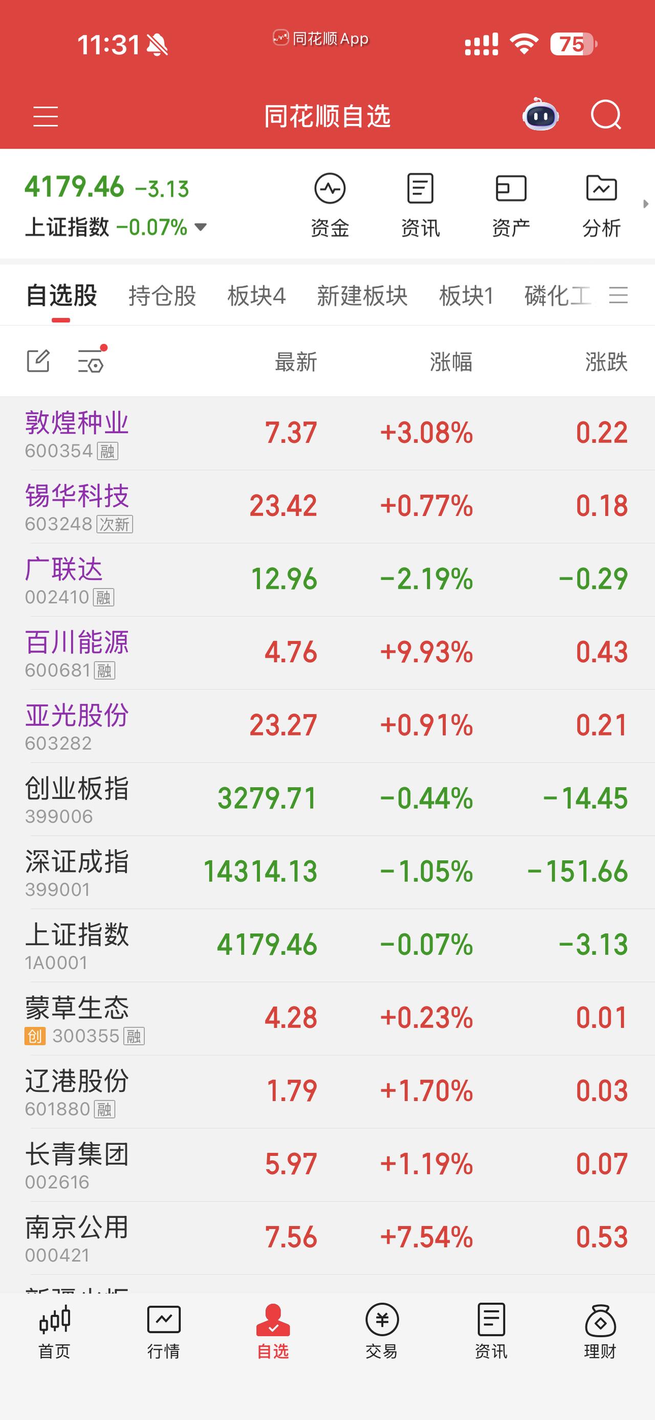 上午股市点评。 一、上午整体速览(截至11:30) • 指数:沪指震荡偏强、深成指/创业板偏弱,沪强深弱 • 沪指:约 4145点,小幅震荡;深成指/创业板 均跌约 -0.8% 左右 • 量能:半日成交约 1.29万亿,较昨日同期略缩 • 涨跌比:1011涨 / 4367跌,极端分化,跌多涨少 • 资金:主力净流出超 750亿;北向小幅净流入 二、板块:油气独大,避险主线大切换 • 最强主线:石油石化/油气 地缘催化+油价大涨,板块涨停潮:三桶油、通源石油、准油股份、石化油服 等多股涨停;燃气、油服、海运 同步走强 • 领跌重灾区 ◦ 军工:指数大跌 -5.38%,无人机、信息化领跌,航亚科技等多股跌超10% ◦ 贵金属/黄金:集体走弱,避险逻辑被资金抛弃 ◦ 半导体/AI/科技成长:普遍调整,资金流出明显 • 其他:农业/种业(敦煌种业所在)逆势红盘,属避险+粮食安全支线;银行、煤炭等权重护盘 三、核心结论(一句话) 权重护盘、指数不崩,但个股普跌;资金极致抱团油气,军工/黄金/科技全面失血,结构性行情极端化 四、下午看点 1. 油气能否持续、是否开板分流 2. 沪指 4100点 支撑是否有效 3. 尾盘资金是否回流成长/超跌