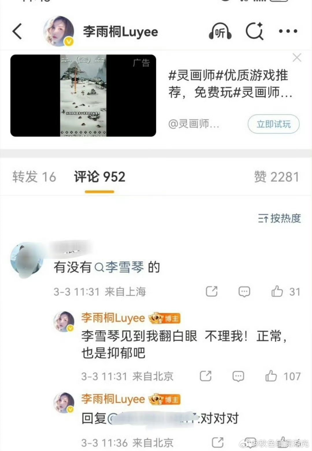李雨桐曝李雪琴见到她翻白眼李雨桐称李雪琴见到她翻白眼 李雨桐问网友还想知道什么瓜,然后她就在评论区曝李雪琴见到她翻白眼。