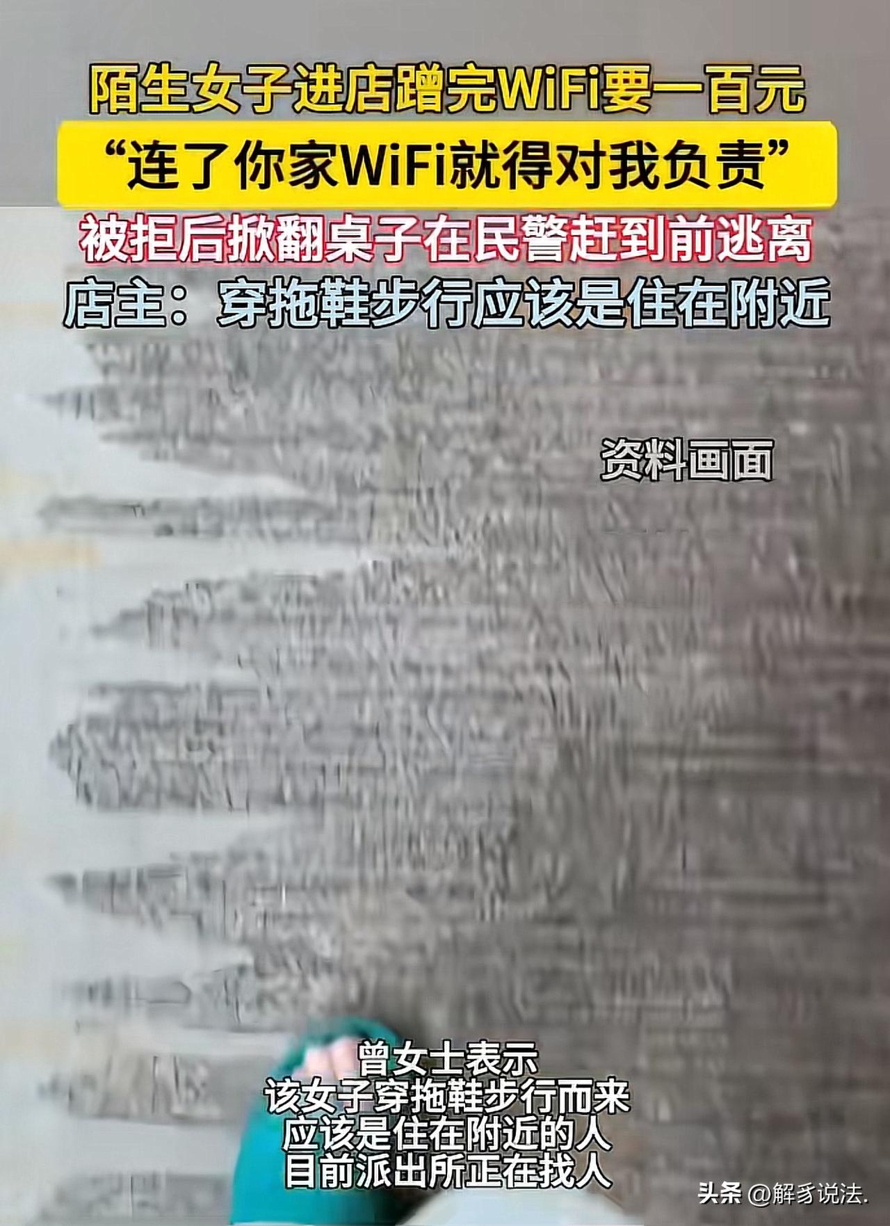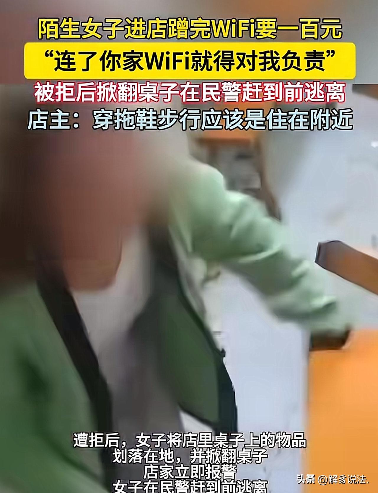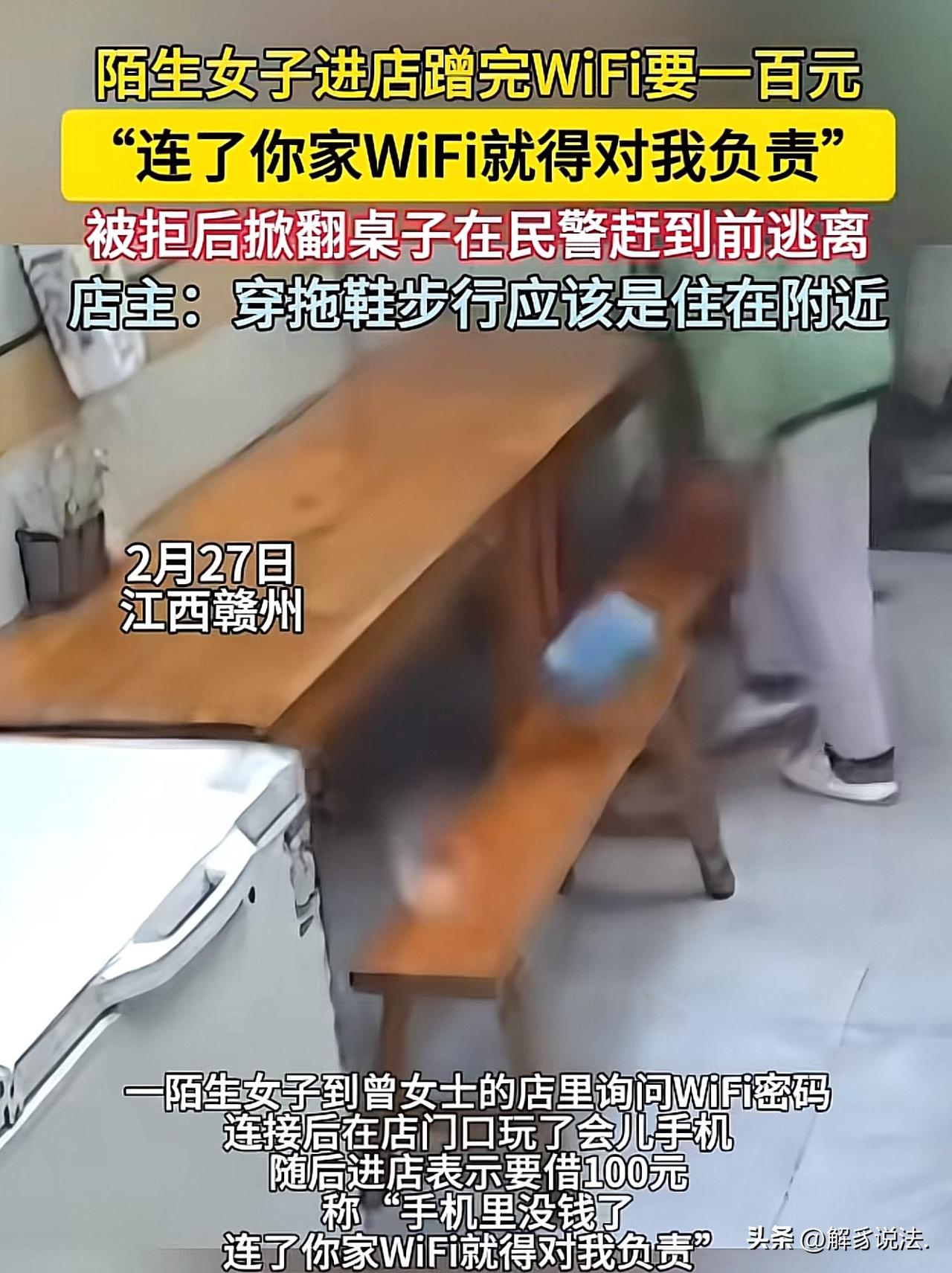 “这讹人的手段也太离谱了!”江西赣州,女子进入一家小饭店里,向老板娘要WiFi密码,老板娘没多想,就给了她。谁知,不一会的功夫,女子又向老板娘借100元钱。老板娘认为与其素不相识,没理由借给她,就果断拒绝了。女子怒怼:我手机里的钱全没了,就因为连了你们饭店的WiFi,你必须借给我!老板娘懵了,不想与其纠缠,说:你再无理取闹,就报警。接下来女子的做法意想不到。 曾女士开了一小饭店,生意还不错,她平日里为人和善,从不与人发生争吵。 即使偶尔店里发生一些顾客无缘无故找茬的情况,她也压着火气,大事化小,小事化无。 她知道,做生意讲究的就是和气生财。 然而,尽管这样,还是发生了一件意想不到的事情。 2月27日,曾女士像往常一样在店里忙碌着,只见一名穿拖鞋的年轻女子进到店里。 曾女士猜测是附近的居民,来不急换鞋子,就出来了。 有顾客上门,她赶紧笑脸相迎,询问女子想吃点什么。 没想到对方啥也不说,直接询问WiFi密码。 曾女士也没多想,知道现代人都离不开网络,赶紧把WiFi密码告诉给了对方。 女子连上WiFi之后,也没进店消费,就安安静静站在饭店门口玩手机,曾女士猜测就是蹭WiFi的,便也没多说什么,继续忙自己手头的事去了。 大概20多多分钟过去了,谁也没料到,接下来的事直接把曾女士给整懵了。 这名女子突然走进店里,张口就向曾女士借100块钱。 曾女士懵了,就一面之缘,哪有张嘴就向陌生人借钱的道理? 张女士婉言拒绝了,本以为女子被拒后,就走人了呗。 谁知,她冲曾女士大声喊到:我手机里的钱全没了,都是因为连了你们饭店的WiFi,你必须对我负责,这100块钱你必须借给我不可。 这话一出,曾女士当场就愣住了,哪有这种道理,自己好心好意分享WiFi,怎么还成就被讹上了?真是无理取闹! 曾女士越想越觉得荒唐,直接明确拒绝了女子的无理要求。 没想到,女子还赖着不走,曾女士不与其纠缠,就让她赶紧离开,并警告她,再不走就要报警处理。 没想到这句话直接激怒了对方,女子瞬间情绪失控,在饭店里开始撒泼闹事。 她伸手就把桌子上的东西全都扒拉到地上,杯子、餐具摔了一地还不够,干脆直接把吃饭的桌子给掀翻了,好好的饭店被她折腾得乱七八糟,地上全是破损的物品和垃圾。 发泄完之后,女子二话不说转身就跑,曾女士反应过来后一边赶紧打电话报警,一边追了出去,可最后还是让女子在民警赶到之前跑掉了。 目前,当地警方已经介入这件事,正在全力寻找这名闹事的女子。 事后,曾女士把此事曝光到了网上,提醒其他同行小心,避免女子进门闹事,影响生意。 这件事曝光后,网友炸锅了: 有人提出质疑:连了人家wiFi,还要上人家借100块钱,讹人手段太粗劣了吧? 还有人气到肝疼:一个大嘴巴子扇过去,让她找不到北,嚰叽啥,还麻烦帽子叔叔! 《治安管理处罚法》第30条规定,有下列寻衅滋事行为之一的,处五日以上十日以下拘留,可以并处一千元以下罚款;情节较重的,处十日以上十五日以下拘留,可以并处二千元以下罚款…. 女子无理索赔、当众打砸店铺,严重扰乱经营秩序,符合寻衅滋事的构成条件。 《刑法》第275条 故意毁坏财物罪:故意毁坏公私财物,数额较大或有其他严重情节的,处三年以下有期徒刑、拘役或罚金。 女子损毁了店里的财务,无论是否达到刑事门槛,女子都必须赔偿全部损失,并依法接受治安管理处罚,并对涉事贩店进行赔偿。 也有部分网友怀疑女子是精神病患者。 那么,在法律的角度,女子若是精神病患者,就可以逃避法律责任了吗? 《刑法》第18条规定:精神病人在不能辨认或者不能控制自己行为的时候造成危害结果,经法定程序鉴定确认的,不负刑事责任,但是应当责令他的家属或者监护人严加看管和医疗;在必要的时候,由政府强制医疗。 即使女子患有精神疾病,也必须经过法定精神病鉴定,只有证实其砸店时完全无法辨认或控制自身行为,才能免除刑事责任。 从她的行为来看,逻辑清晰、目的明确,基本不属于无自控能力的情形。 即便免除刑事责任,民事赔偿责任也无法逃避,其监护人需对店内损毁物品承担全部赔偿责任。