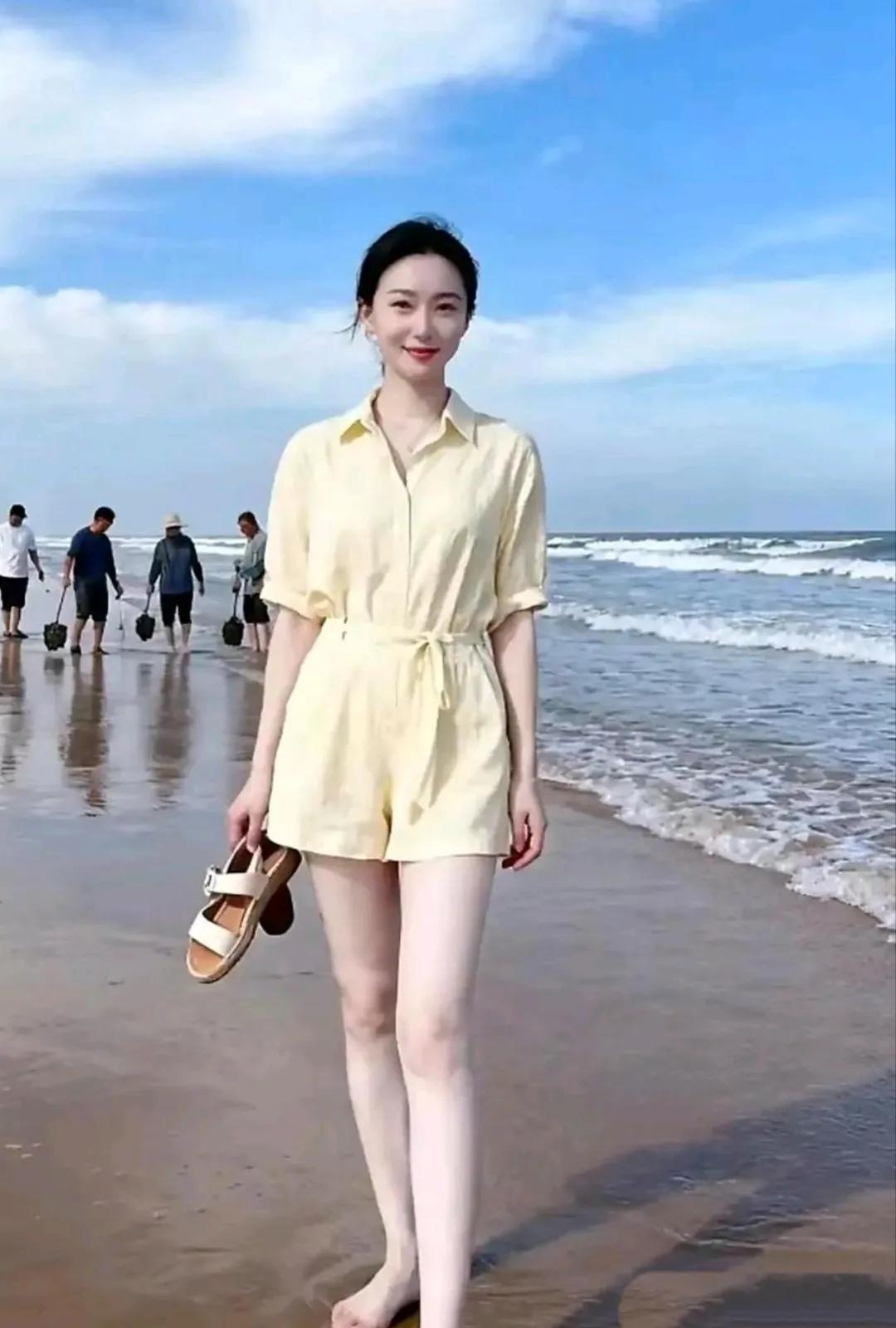 佳人美丽面容娇,海边漫步乐逍遥。