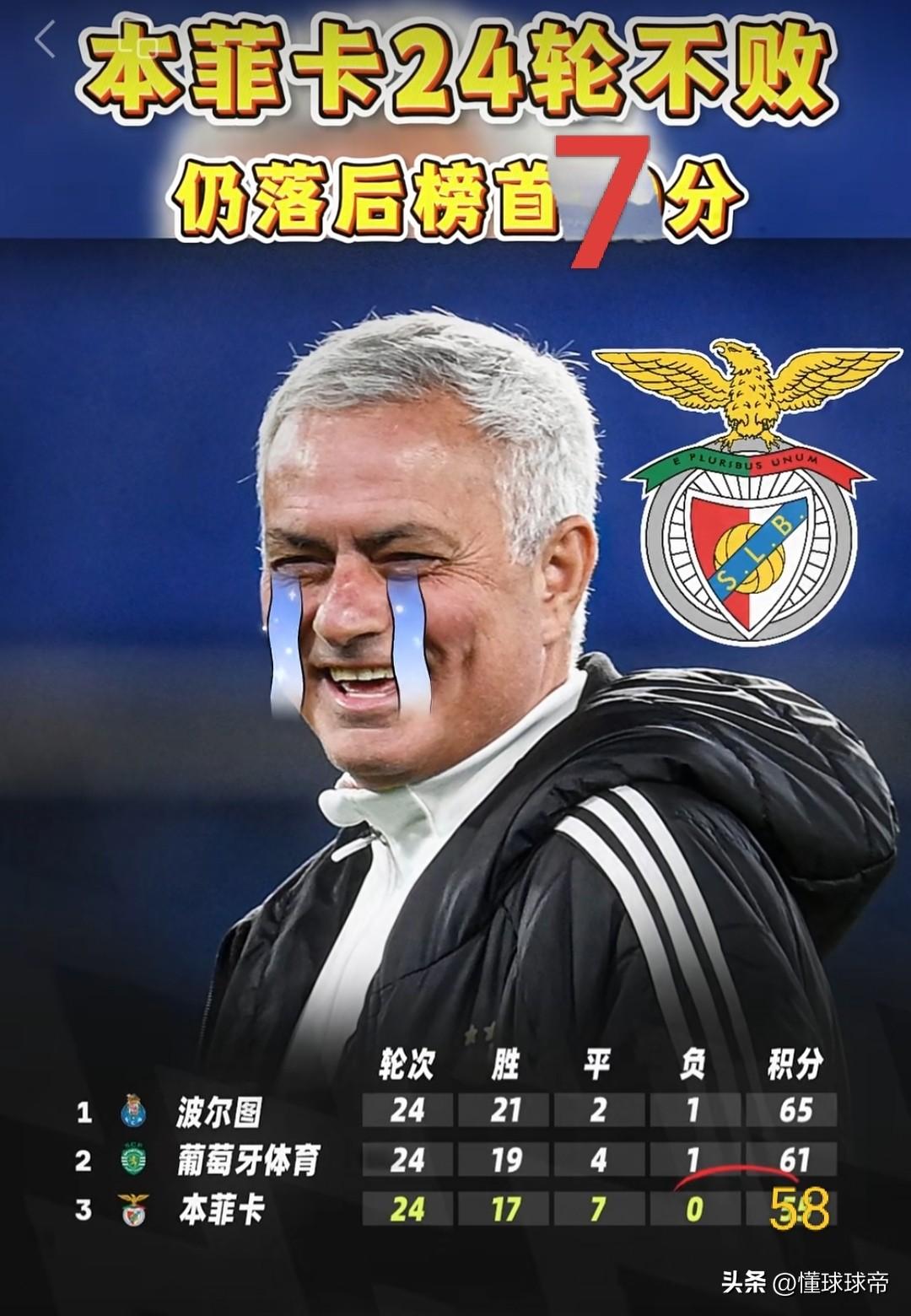 穆里尼奥太难了,本菲卡在联赛24轮不败竟然还落后榜首7分! 在本轮葡超联赛中,穆里尼奥执教的本菲卡2-1战胜维森特,本赛季开赛以来已经取得了24轮不败战绩(17胜7平),但是在积分榜上,本菲卡竟然只排名第三,距离榜首波尔图竟然落后了7分。 波尔图目前取得了21胜2平1负的战绩积65分,而本菲卡则是17胜7平积58分,本菲卡的平局太多导致虽然不败但是两场平局就相当于一场输球了。 穆里尼奥真的是太难了,在土超被无敌的加拉塔萨雷压制,现在来到了葡超又被无敌的波尔图压制,不过下一轮葡超联赛本菲卡将坐镇主场迎战波尔图,如果本菲卡战胜波尔图的话,那么积分差距就缩小到了4分,葡超联赛冠军还有悬念。 如果本赛季波尔图取得了不败战绩但是却无缘葡超冠军的话,穆里尼奥又创造了奇迹了。