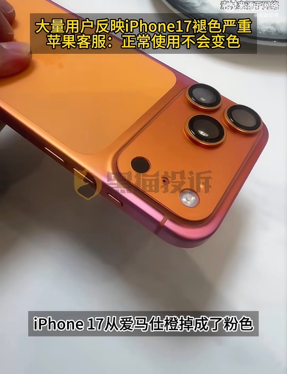 iPhone17只用一个月橙色变粉色高饱和色系确实容易掉色,估计是沾染化学试剂发生反应了,正常掉色都是漆面磨损。按理来说也不属于质量问题,目前来看也都是个例。