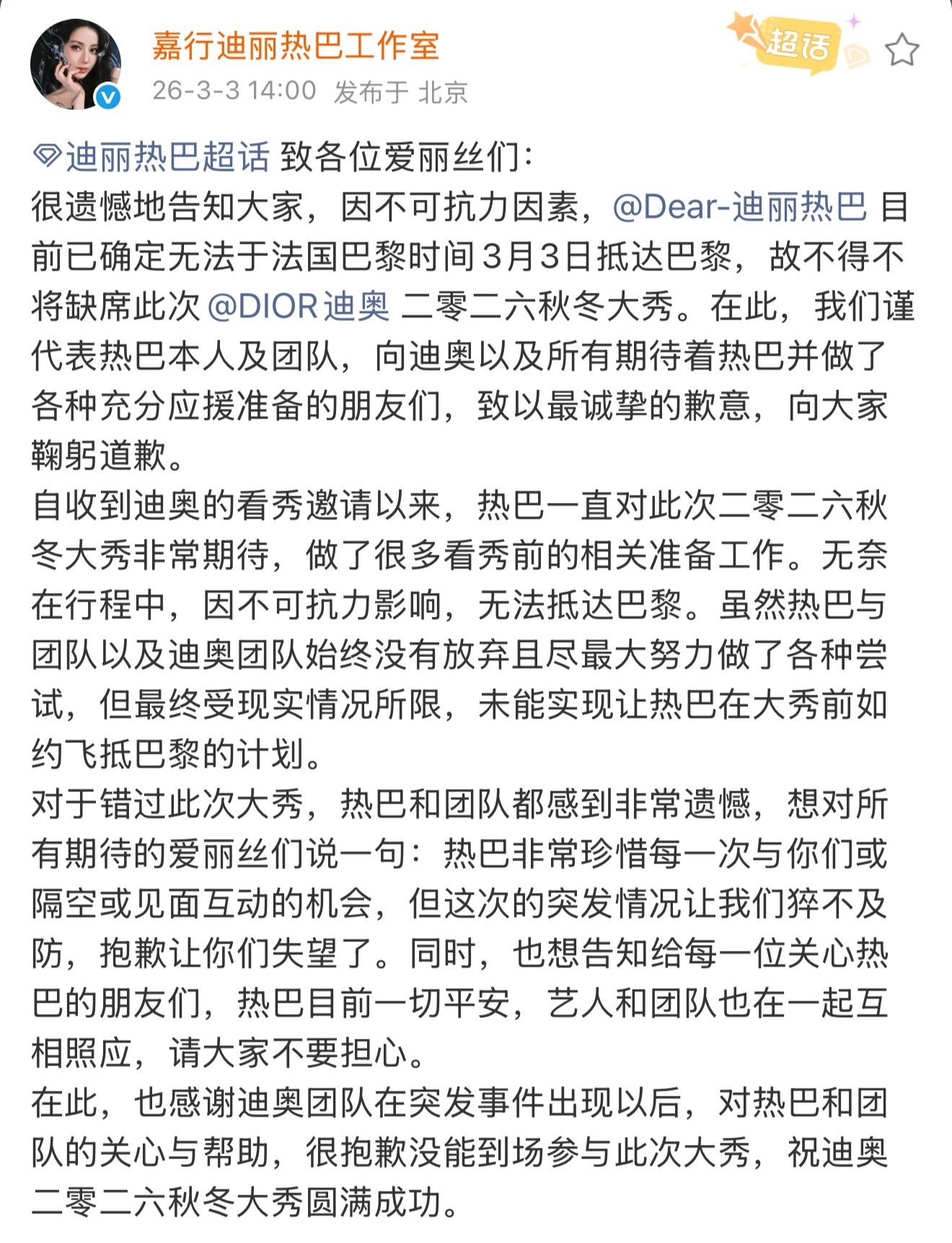 迪丽热巴工作室发文,热巴因不可抗力因素不得不缺席本次时装周大秀,也表示热巴目前一