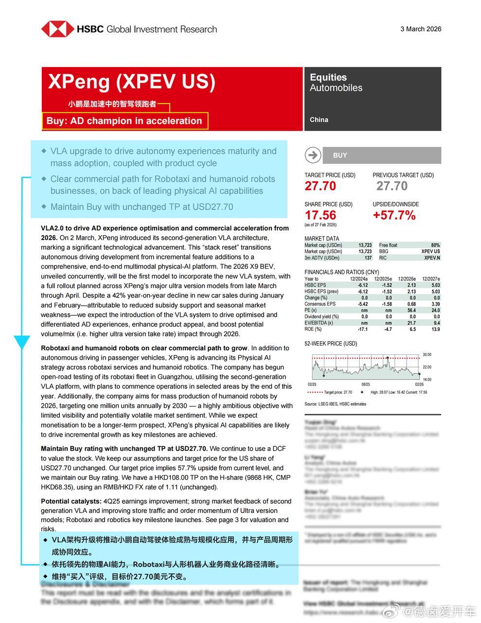 摩根士丹利、美国银行、汇丰银行在内的多家全球头部券商强推小鹏,给出“买入”评级。