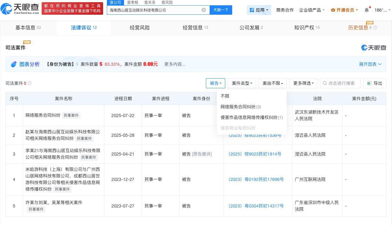 尘白禁区运营方曾因侵权被告 尘白禁区运营方揭秘尘白禁区停服 近日,尘白禁区官方公告于2026年3月2日23:59起无限期停机维护,引发网友讨论。 天眼查App显示,尘白禁区运营方海南西山居互动娱乐科技有限公司成立于2021年1月,法定代表人为邹涛,注册资本100万人民币,经营范围包括网络文化经营、第二类增值电信业务、食品经营、出版物零售、出版物互联网销售等,由珠海西山居世游科技有限公司全资持股。法律诉讼信息显示,该公司曾因网络服务合同纠纷、侵害作品信息网络传播权纠纷被起诉。 天眼查信息: