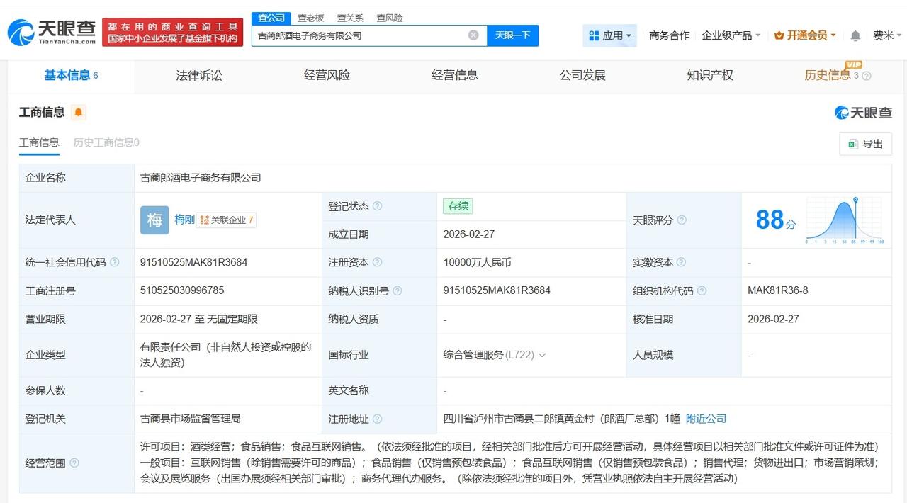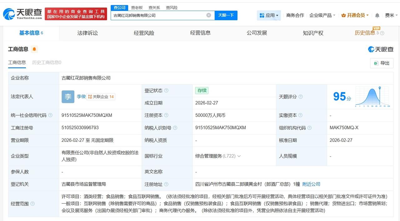 郎酒股份出资11亿成立三家新公司 天眼查工商信息显示,近日,泸州龙马郎销售有限公司、古蔺红花郎销售有限公司、古蔺郎酒电子商务有限公司成立,法定代表人分别为梅刚、李俊、梅刚,注册资本分别为5亿人民币、5亿人民币、1亿人民币,经营范围包括酒类经营、食品销售、食品互联网销售等。股东信息显示,上述三家公司均由四川郎酒股份有限公司全资持股。 天眼查信息: