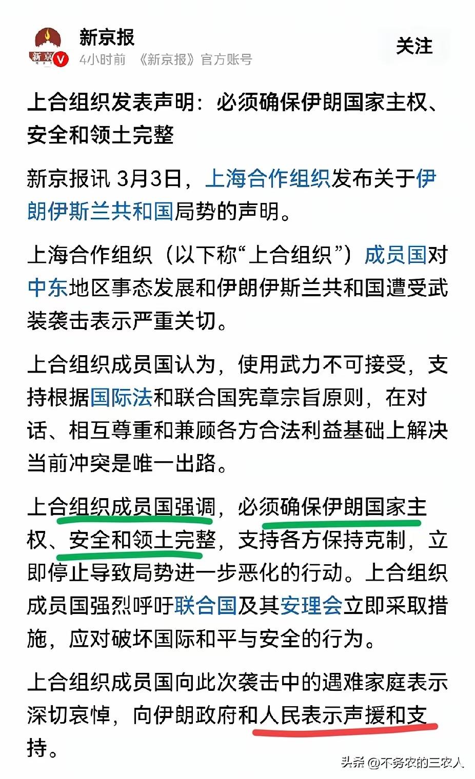 上合重磅发声!伊朗的“底气”,终于来了。 3月3日,上合组织关于伊朗局势的声明一经发布,便给沸腾的中东局势按下了一枚关键的“定调键”。这声迟来的正义,恰恰印证了一个铁律:在大国博弈的棋局里,援助从来不是施舍,而是对强者决心的精准注资。 此前坊间早有预判:只要伊朗不低头、不妥协,将反制进行到底,来自东方的强力支撑必会到来。如今,上合的旗帜正式竖起,这份声明的分量,远胜千军万马。 这绝非一份空洞的外交辞令,而是字字千钧的“护身符”。“必须确保伊朗国家主权、安全和领土完整”,这句斩钉截铁的表述,直接划下了强权不可逾越的红线。 更关键的是,上合的“出手”,走的是一条远比直接军援更具杀伤力的路线。它不搞军事同盟的捆绑,却能通过外交声援,让伊朗在国际舞台上不再孤军奋战;它不直接输送武器,却能以多边框架为依托,为伊朗撑开抗制裁的经济与战略空间。 伊朗反抗的决心有多大,赢得的支持就有多深。 当伊朗以举国之力直面霸权,用坚决的反制打破“斩首即屈服”的幻想时,它就已经证明了自己的价值。 对于伊朗而言,这是声援,更是底气;对于世界而言,这是秩序,更是希望。