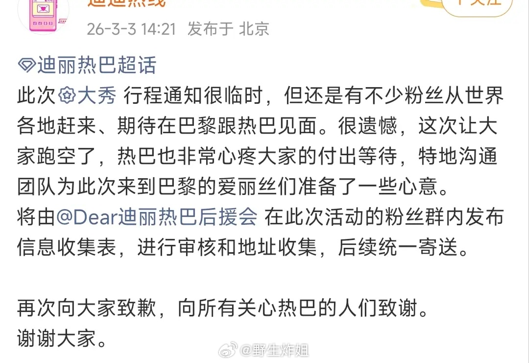 说明迪丽热巴昨晚真的在迪拜滞留,今天才有安全的消息,瞒着粉丝热巴工作室回应缺席时