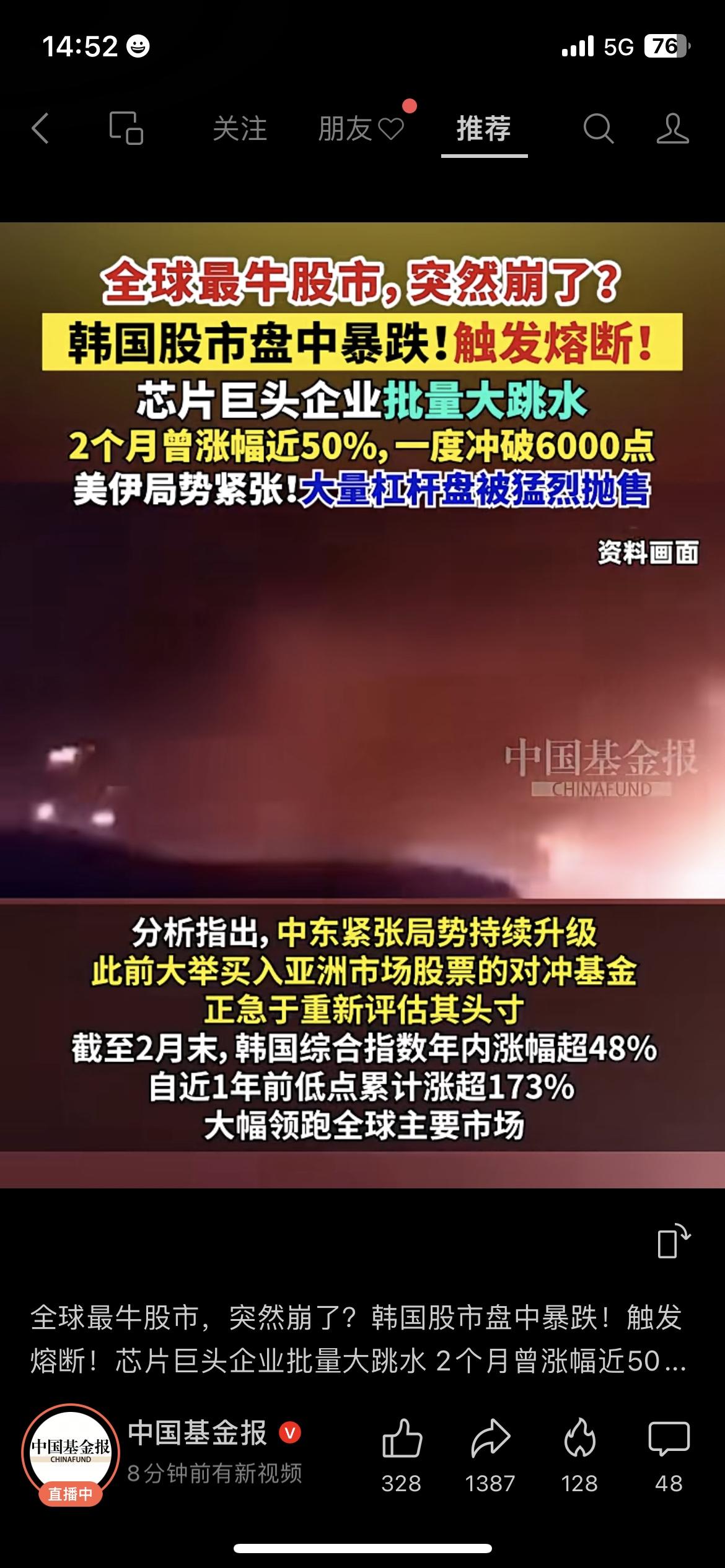 韩国股市暴跌触发熔断,芯片巨头批量跳水中日韩股市 今天全球股市最刺激的一幕,在韩国上演了。 韩国综合指数暴跌,盘中直接触发熔断,芯片、汽车板块集体大跌,不少龙头股跌幅都很夸张。 我身边几个买了相关基金的朋友,今天账户都不太好看。 说白了,外部局势一紧张,资金就会避险出逃,之前涨得猛的地方,调整起来也最凶。 提醒大家: 市场有风险,投资需谨慎,不构成任何投资建议。 别追高,别乱加仓,稳住心态比什么都重要。 你最近基金股票还好吗?来聊聊。 韩国股市 股市熔断 芯片板块
